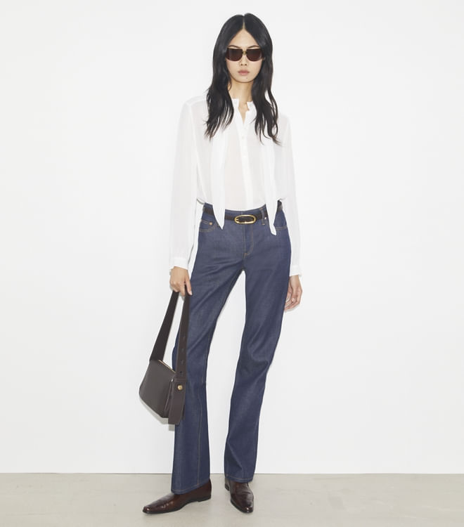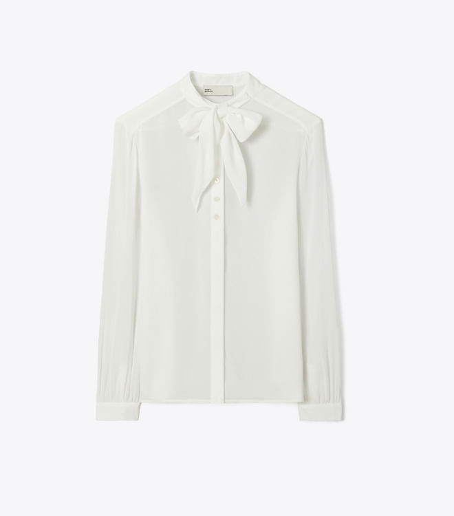 Um estilo que revisitamos a cada estação, a blusa com laço de georgette é um item essencial no guarda-roupa. Use-a sozinha ou por baixo dos suéteres e jaquetas da estação, amarrada com um laço elegante ou um nó desfiado.