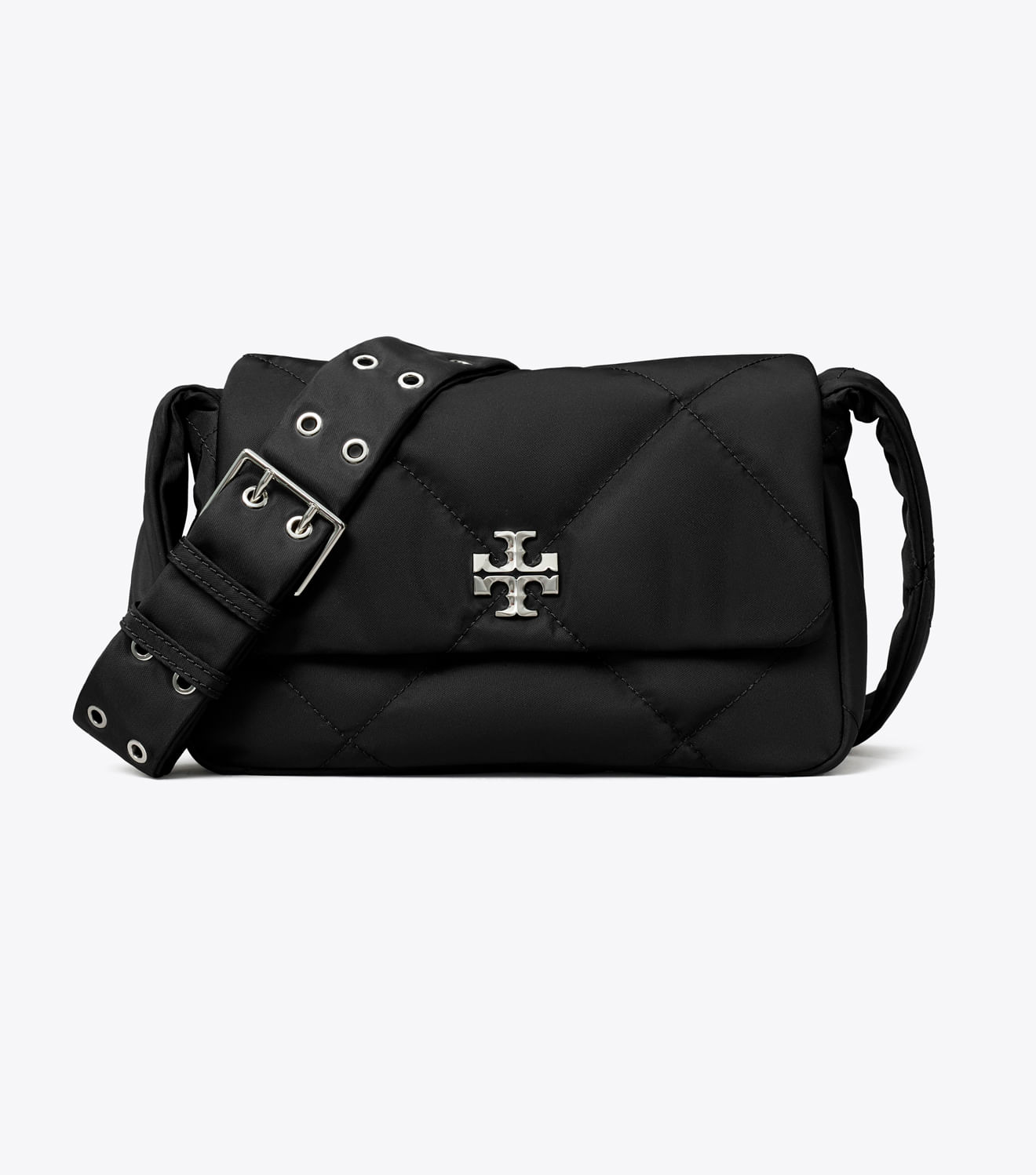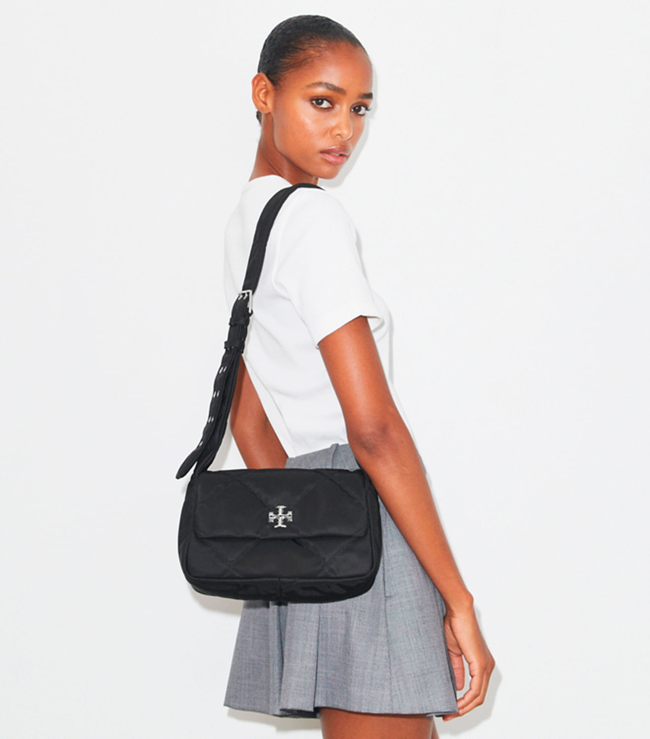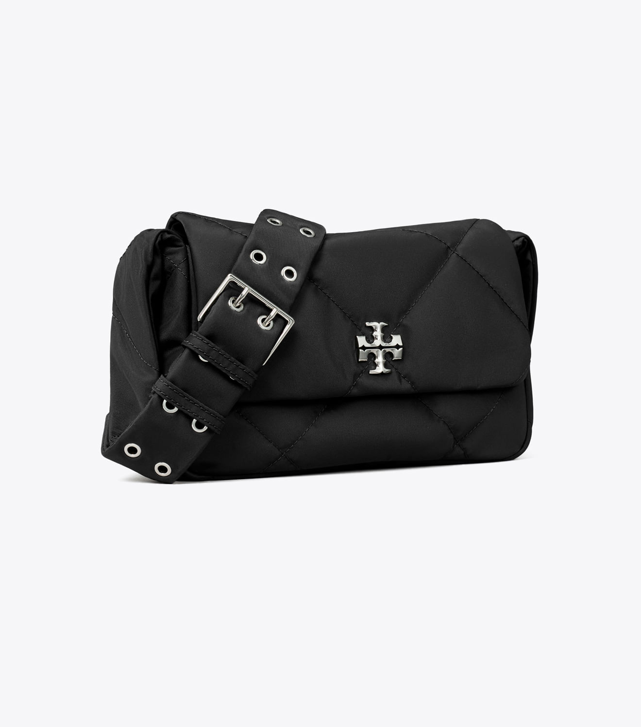 Confeccionada em nylon reciclado com um brilho sutil e detalhes em metal chanfrado com o logotipo duplo em T, a bolsa tiracolo acolchoada Kira Diamond apresenta um design prático com bolso interno e alça ajustável.