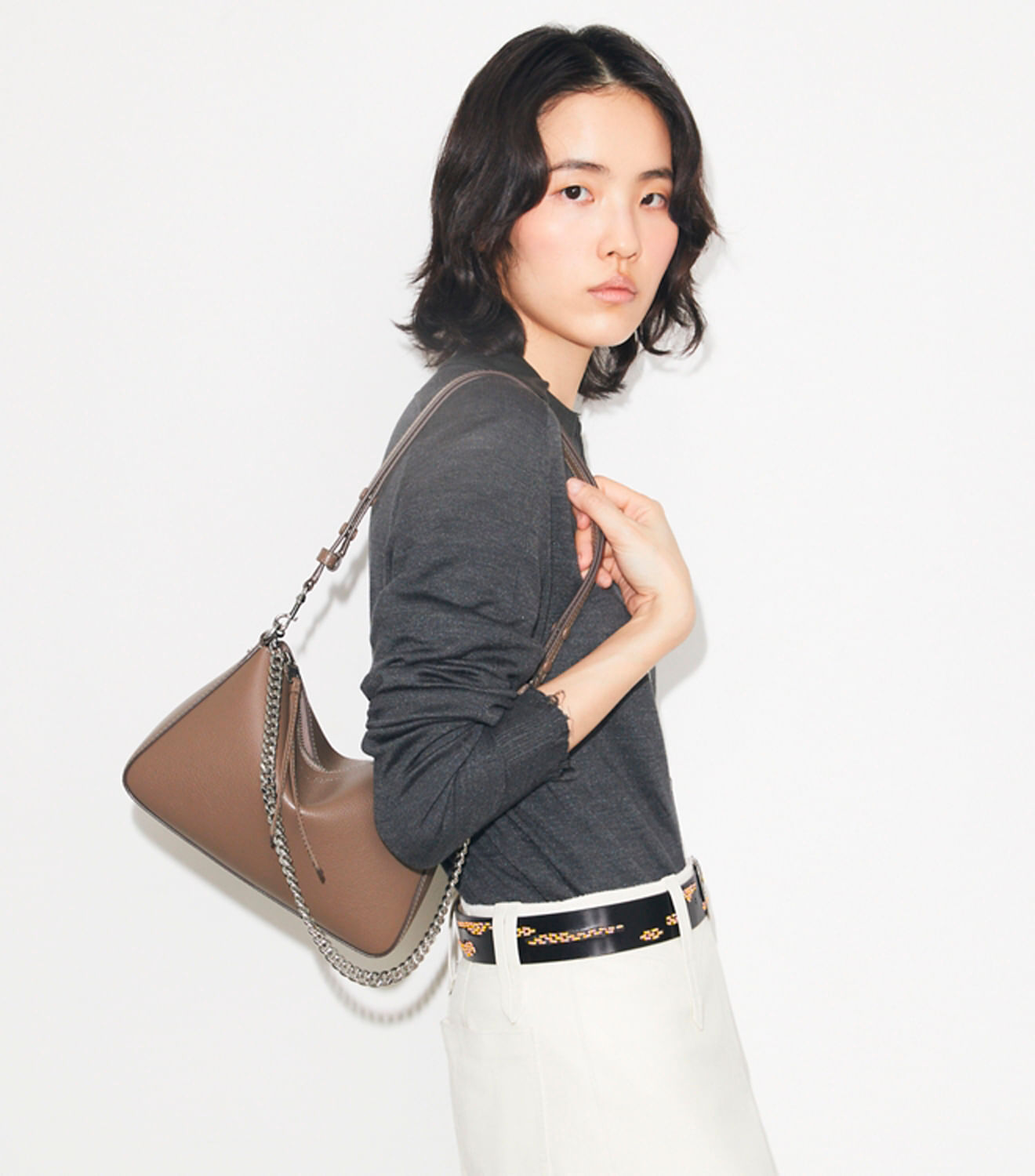 Confeccionada em couro granulado de alta qualidade, a bolsa de ombro pequena Perry transita do minimalismo para um toque de glamour com a adição da corrente. Ajuste a alça de couro para usála no ombro ou transversalmente.