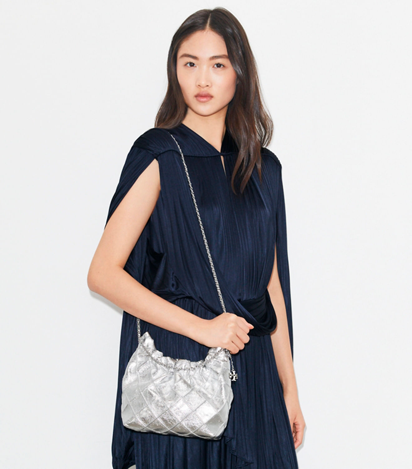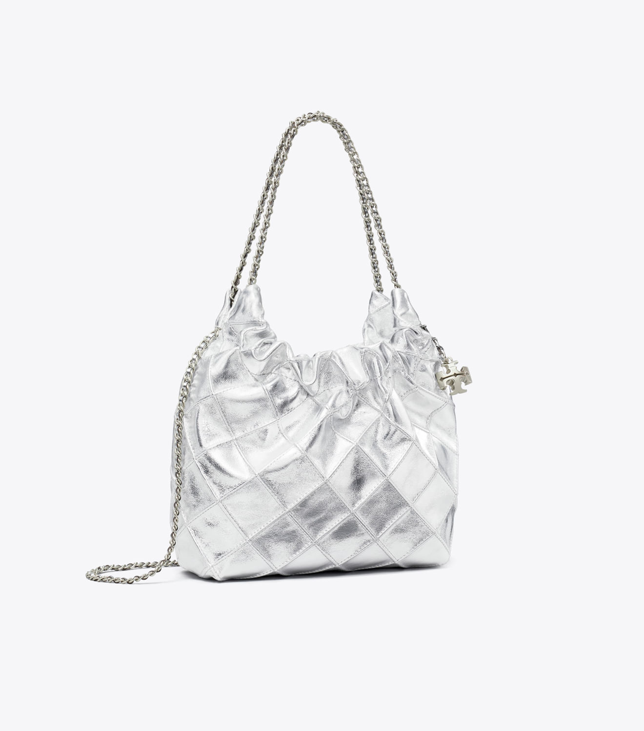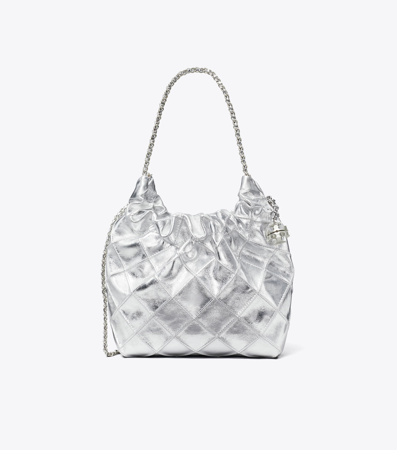 Glamour atemporal. Confeccionada em couro metálico macio, a bolsa Mini Fleming Hobo apresenta detalhes em matelassê com padrão de losangos e uma alça de corrente trançada com detalhes em couro. Finalizada com um pingente com o logotipo Double T.