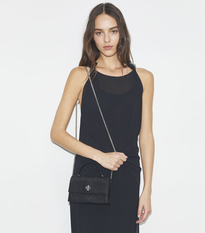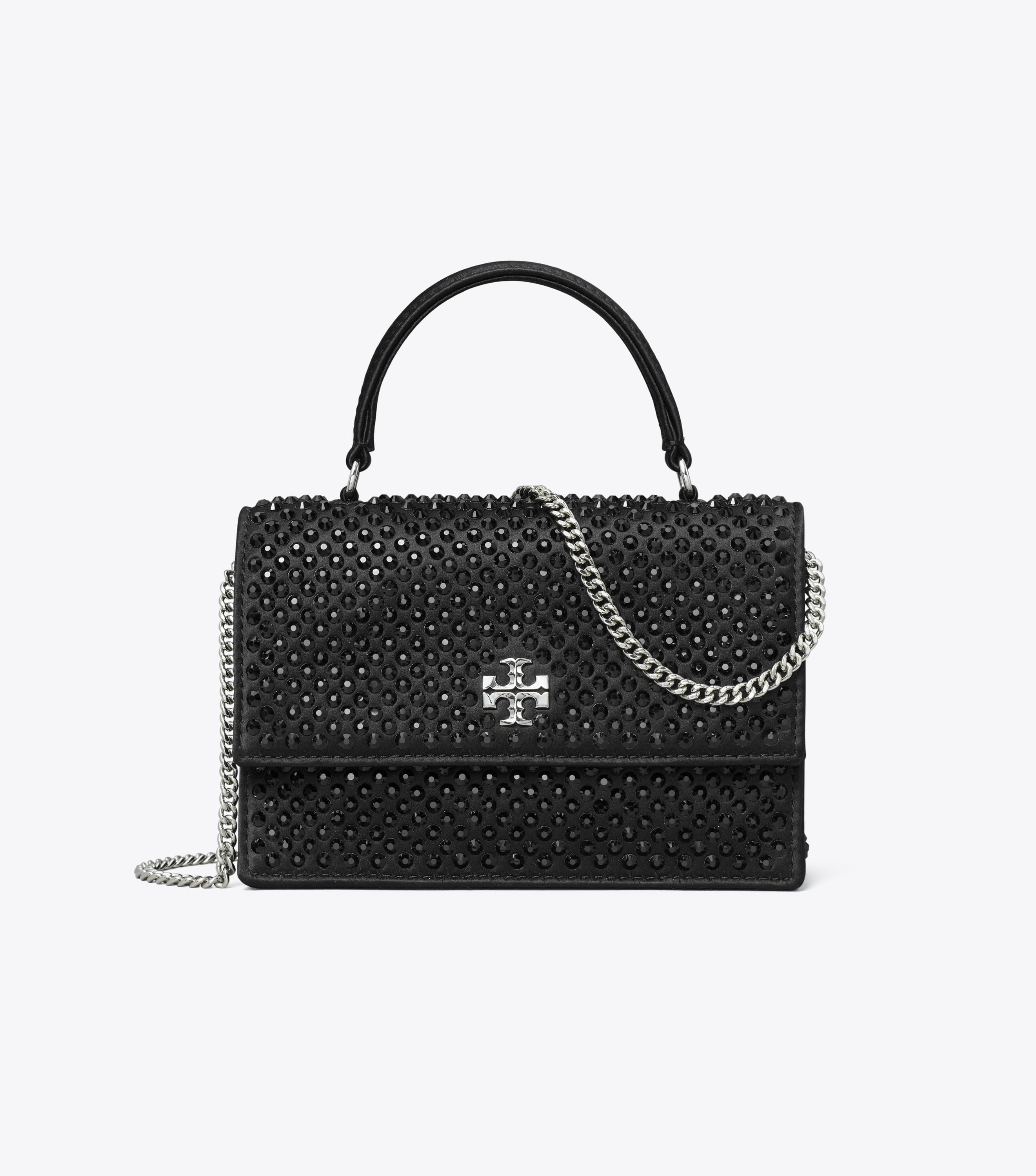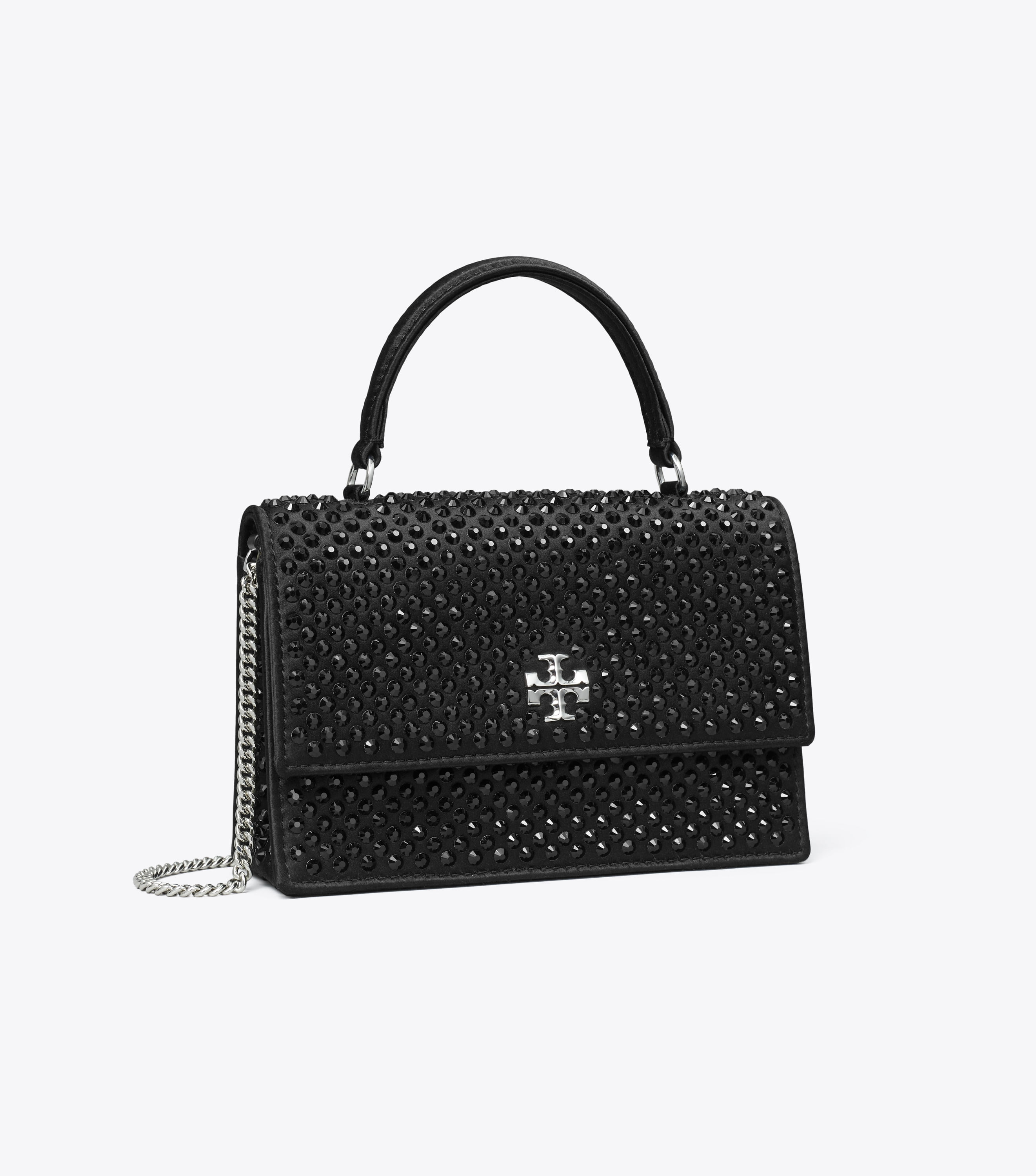 A Bolsa Mini Kira com Alça Superior e Corrente é feita de cetim com aplicações e apresenta nosso Double T como ferragem metálica gráfica. Use-a transversalmente com a alça de corrente removível ou use-a como carteira ou clutch.