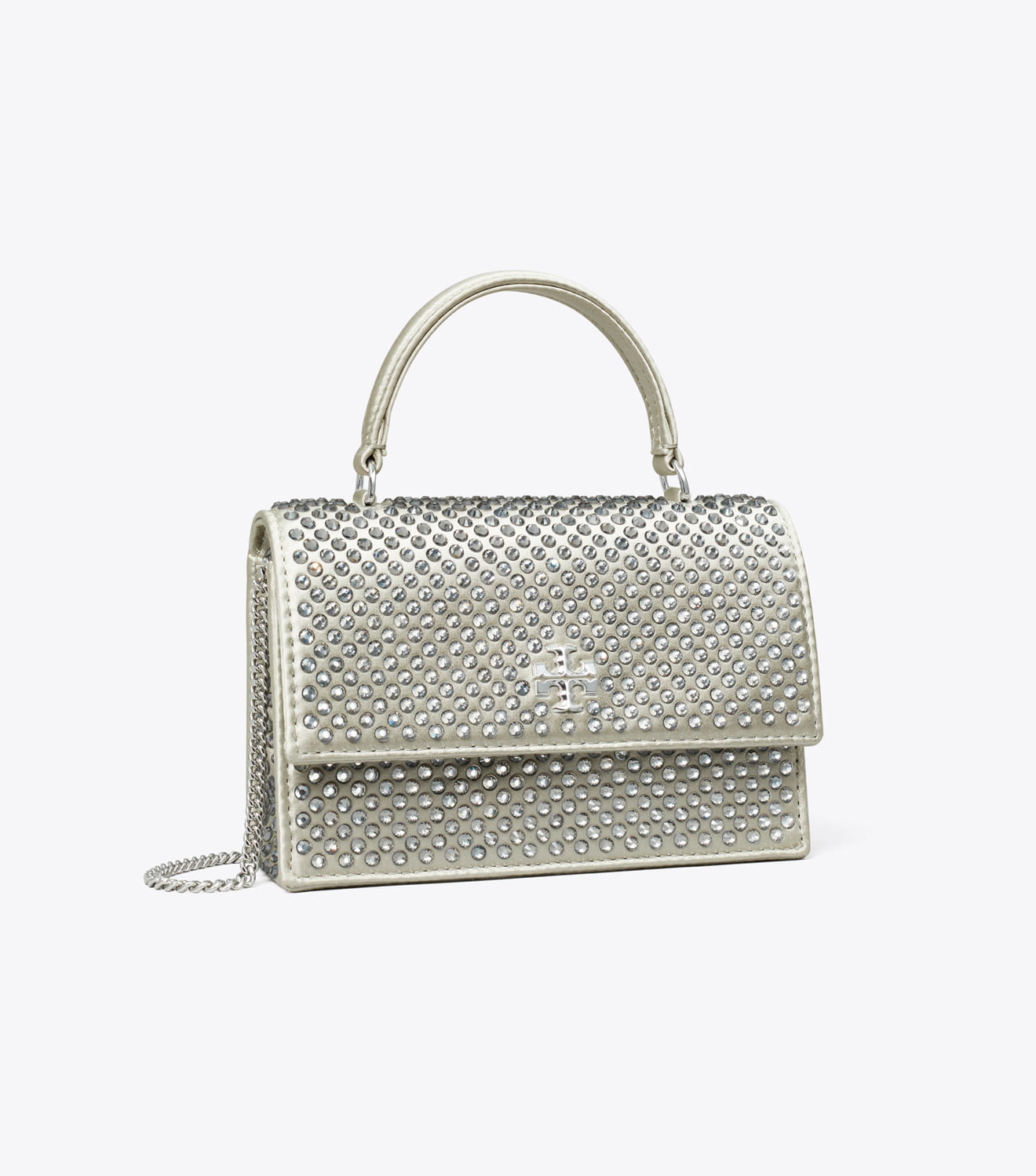 A Bolsa Mini Kira com Alça Superior e Corrente é feita de cetim com aplicações e apresenta nosso Double T como ferragem metálica gráfica. Use-a transversalmente com a alça de corrente removível ou use-a como carteira ou clutch.