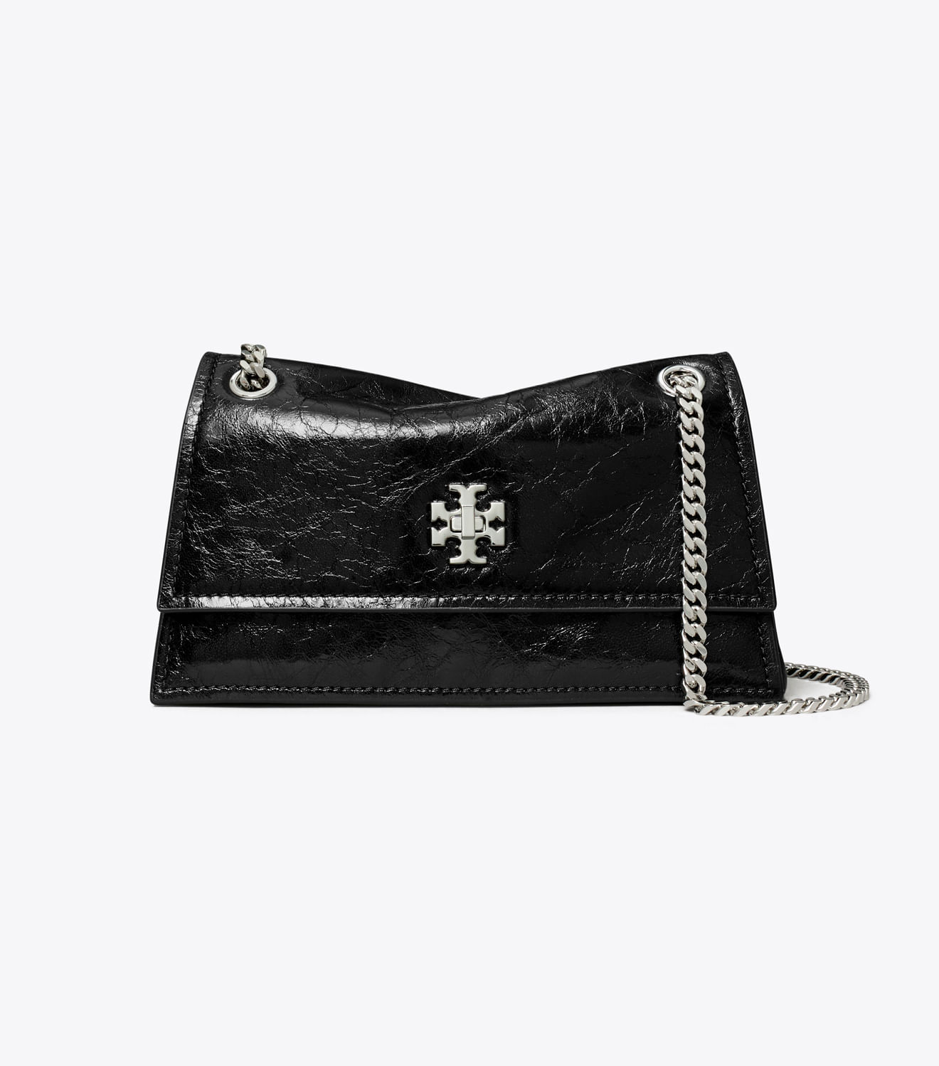 A bolsa de ombro Mini Kira Turnlock apresenta ângulos definidos e detalhes gráficos: uma alça de corrente robusta e um fecho giratório. A silhueta clássica com aba é confeccionada em couro com textura sutil e possui um bolso interno para organização. Fabricada em parceria com uma curtume certificada pelo Leather Working Group, que apoia altos padrões na fabricação de couro e no gerenciamento de produtos químicos.
