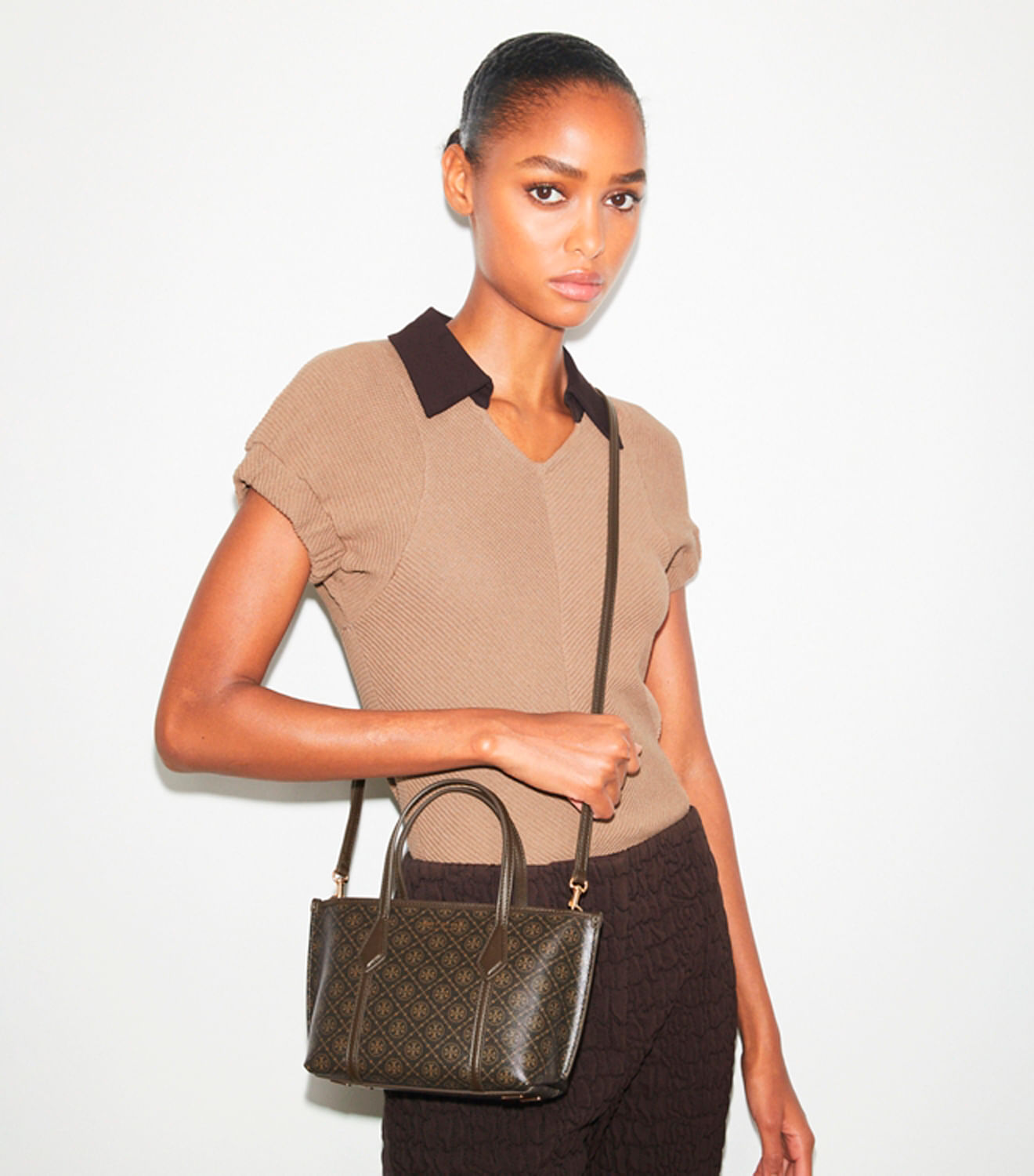 Nosso padrão exclusivo em lona revestida com revestimento externo certificado pelo USDA BioPreferred. Capturando a essência do luxo prático, é durável, resistente à água e mantém sua aparência impecável ao longo do tempo. A Mini Perry Tote é forrada em algodão macio com um bolso interno, finalizada com alças superiores finas e uma alça transversal removível.
