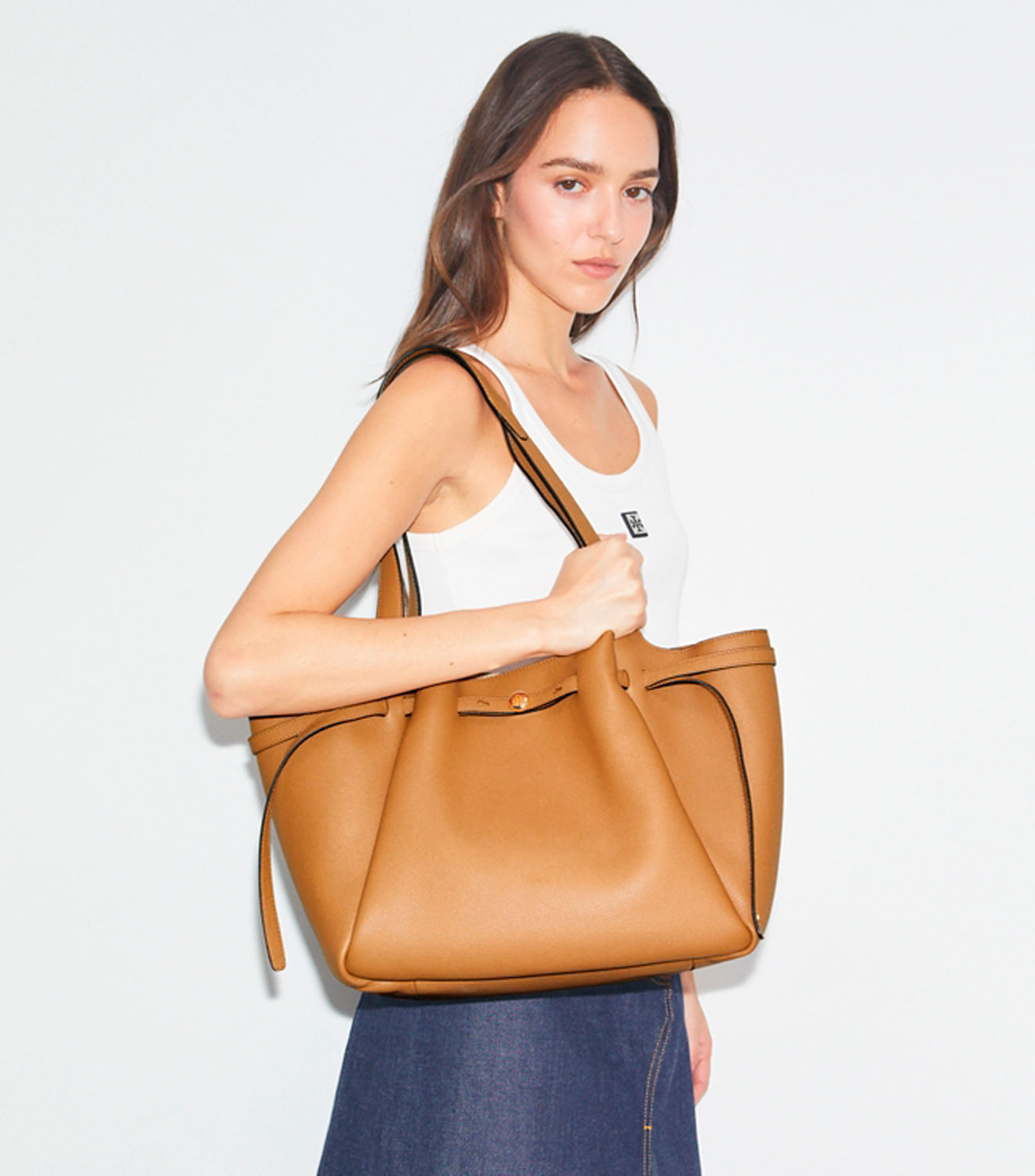 A Bolsa Tote Romy é confeccionada em couro macio granulado com uma silhueta delicadamente franzida. A melhor bolsa para o dia a dia, é leve e tem um interior espaçoso organizado com um bolso profundo com zíper. Detalhada com um cinto fino e nosso novo logotipo de botão. A bolsa, que pode servir como bagagem de mão para viagens, possui uma alça larga para maior conforto. Fabricada em parceria com um curtume certificado pelo Leather Working Group, apoiando altos padrões na fabricação de couro e gerenciamento de produtos químicos.