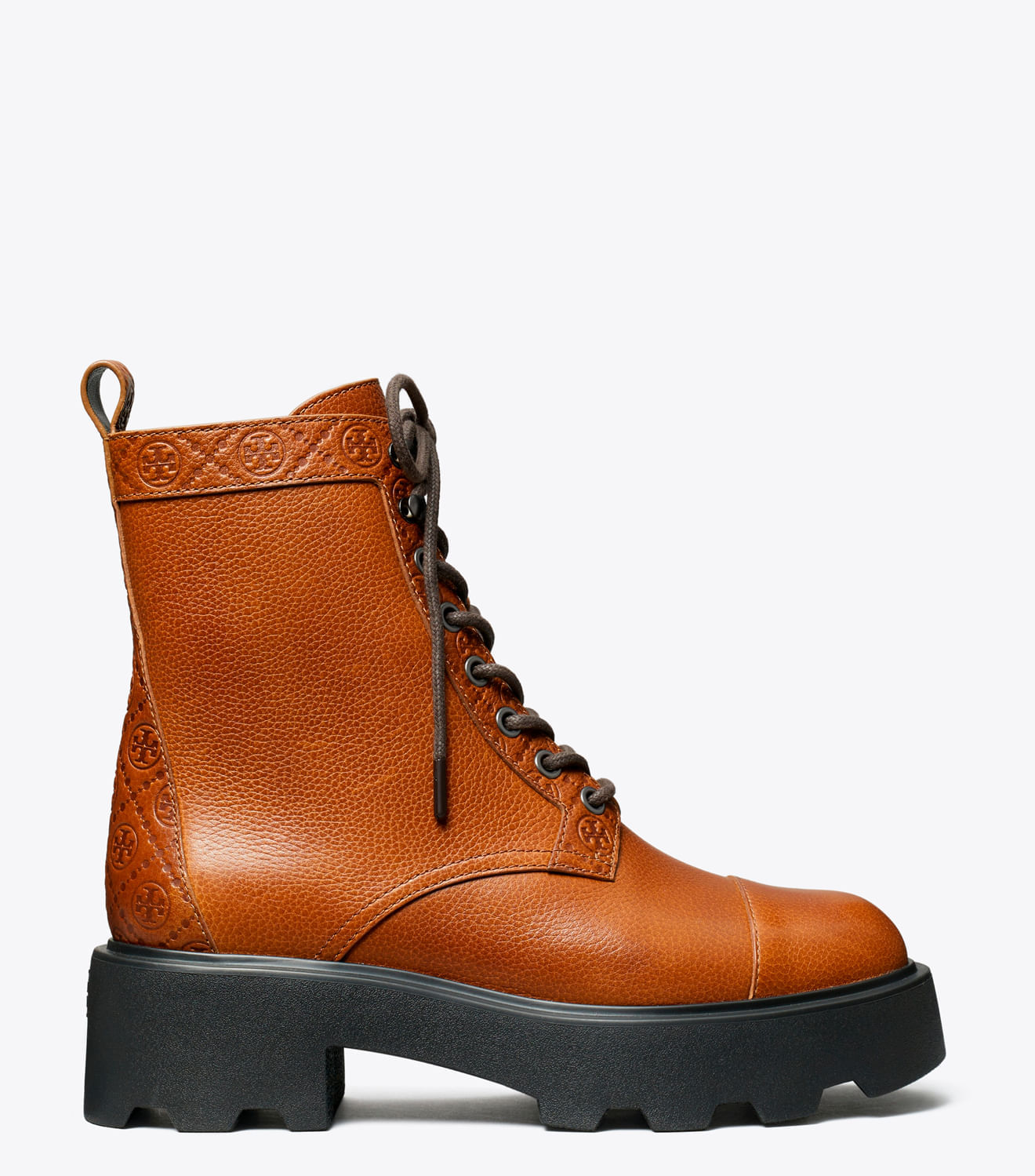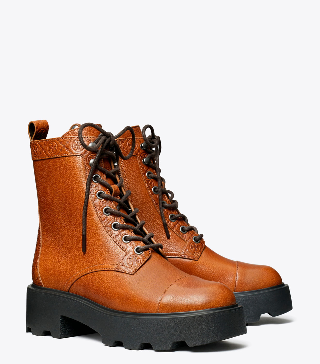 Nossa bota de cano curto estilo militar é confeccionada em couro liso com monograma T em relevo, com fechamento frontal por cadarço e zíper lateral. Um solado tratorado leve em EVA proporciona altura e ranhuras no solado externo garantem tração.Fabricada em parceria com um curtume certificado pelo Leather Working Group, que preza pelos altos padrões de fabricação de couro e gestão de produtos químicos.