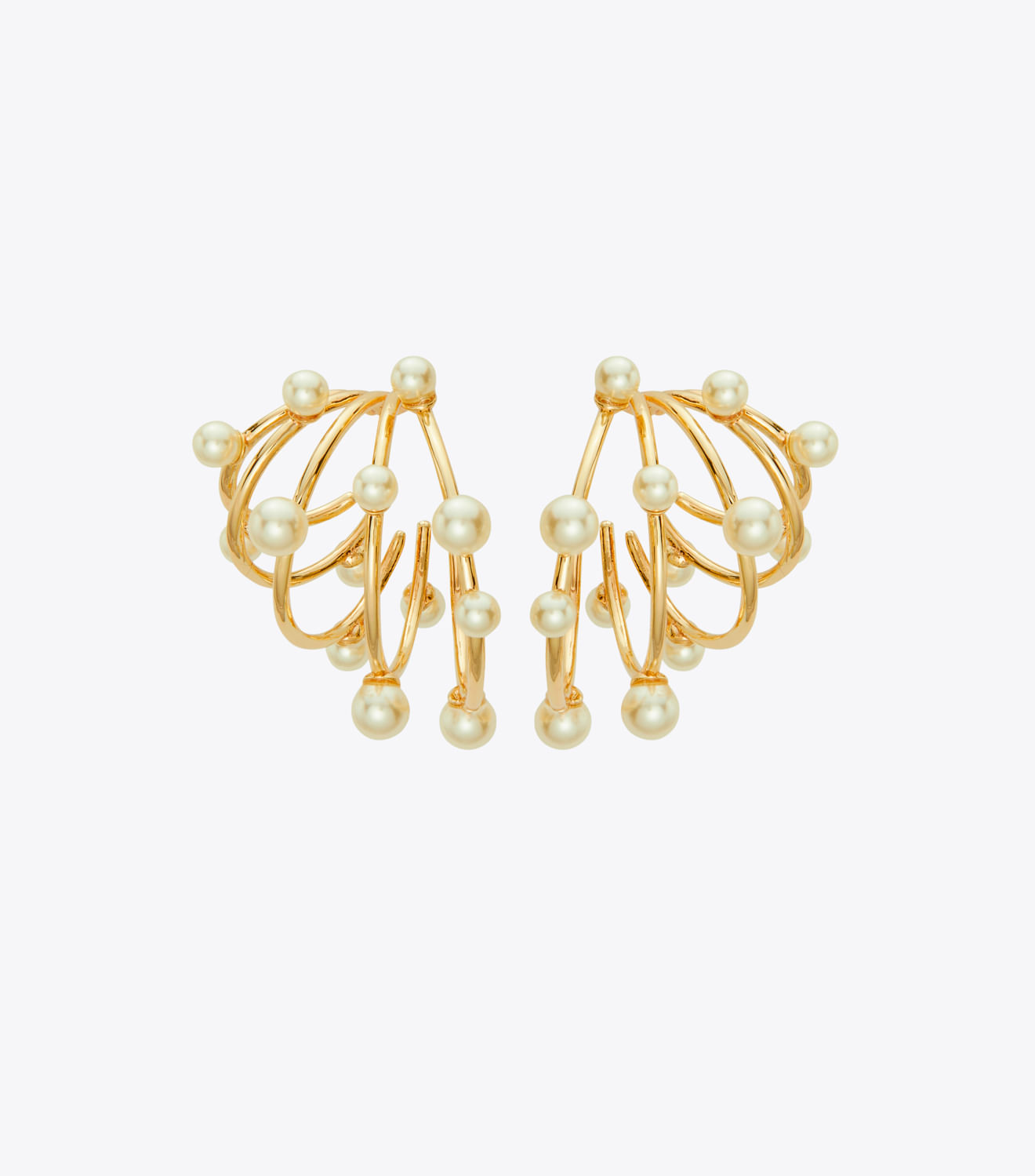 O brinco Kira é um conjunto de cinco argolas em uma só, que abraçam a orelha. Com pérolas de vidro de variados tamanhos.