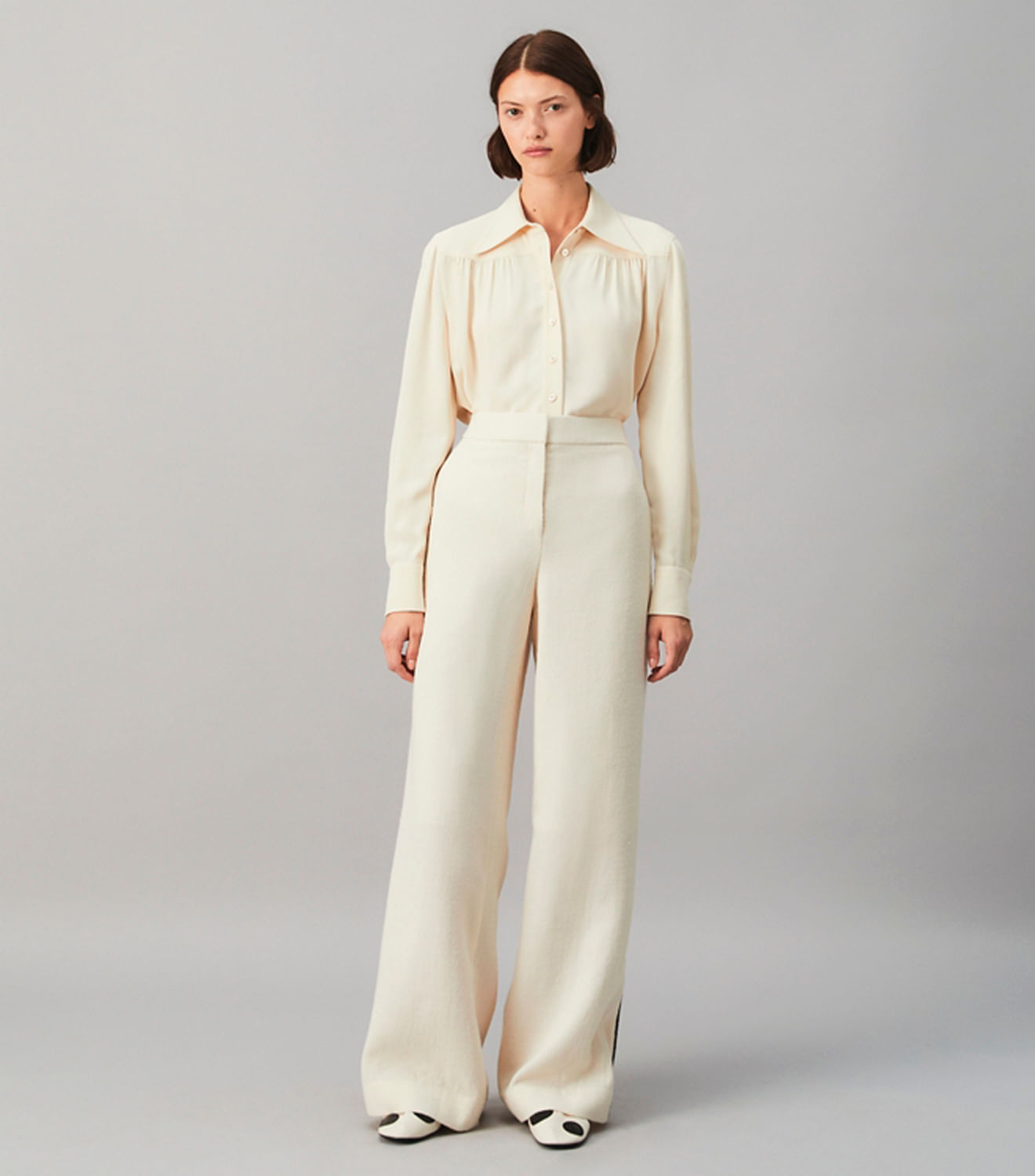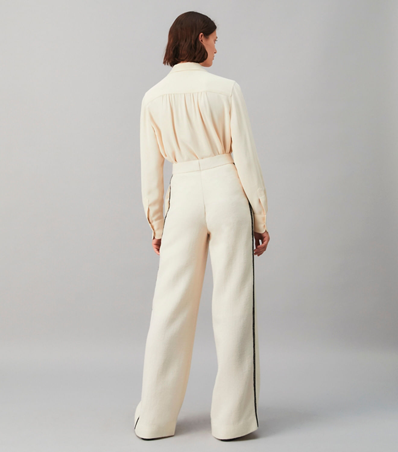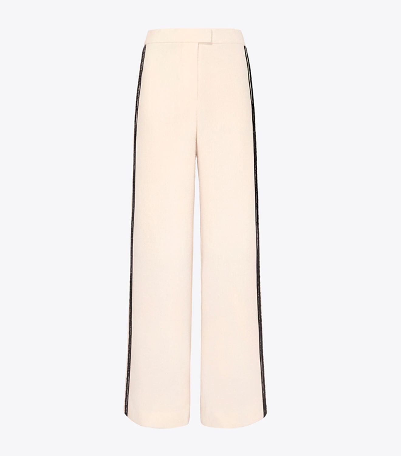 A calça de alfaiataria clássica é confeccionada em sarja de algodão, um tecido confortável e elegante. As faixas contrastando nas laterais definem o tom levemente esportivo.