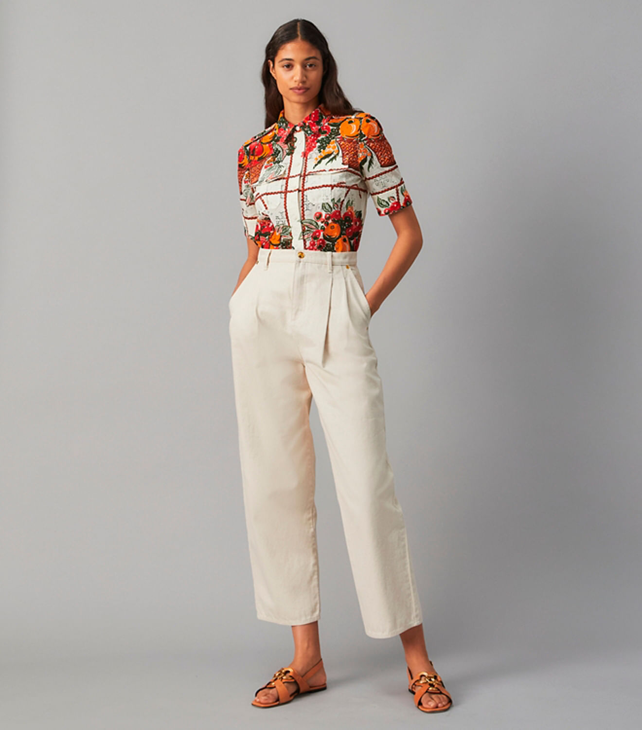 A coleção é definida por linhas limpas, texturas interessantes e silhuetas elegantes. Nossa calça jeans de sarja é confortável e versátil, com cintura alta, pregas na frente e pernas largas e relaxadas.