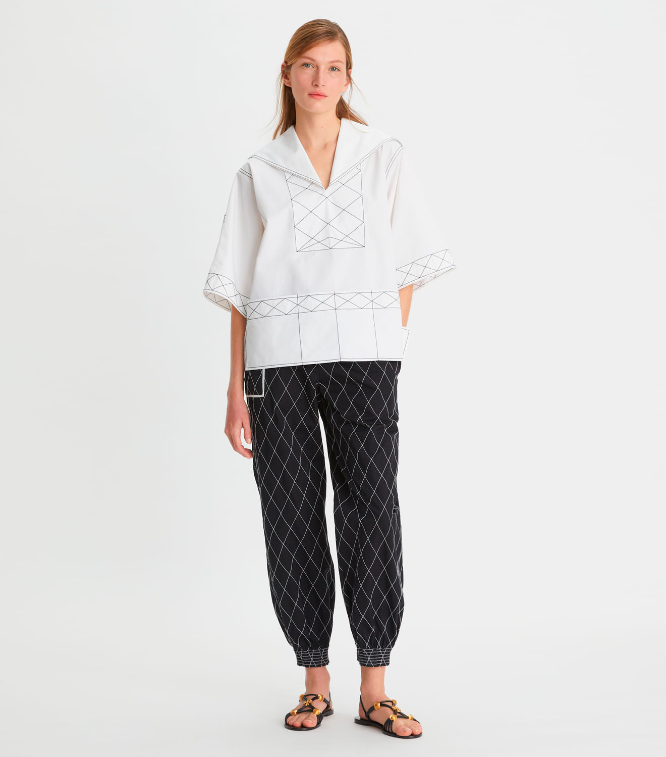 A primavera de 2022 é inspirada na engenhosidade da designer Claire McCardell. Na década de 1940, ela revolucionou a maneira como as mulheres se vestiam, com peças chiques e práticas, com as quais podiam estilizar de maneiras diferentes. Brincamos com contrastes de proporção, tecido, cor e estampa para criar um mix de versatilidade e glamour. Aqui, Tory incorpora um dos famosos recursos de design de McCardell, pesponto, tradicionalmente usado exclusivamente para roupas de trabalho jeans. As nossas calças de popelina de algodão, trabalhadas com efeito acolchoado, são superconfortáveis: a cintura elástica com cordão fica no alto do quadril, são espaçosas em toda a perna e os tornozelos apertados são fáceis de estilizar com as sandálias da estação. A silhueta descontraída a torna perfeita para repetir durante toda a temporada - combinados com túnicas sob medida, malha canelada entrançada e cintos.