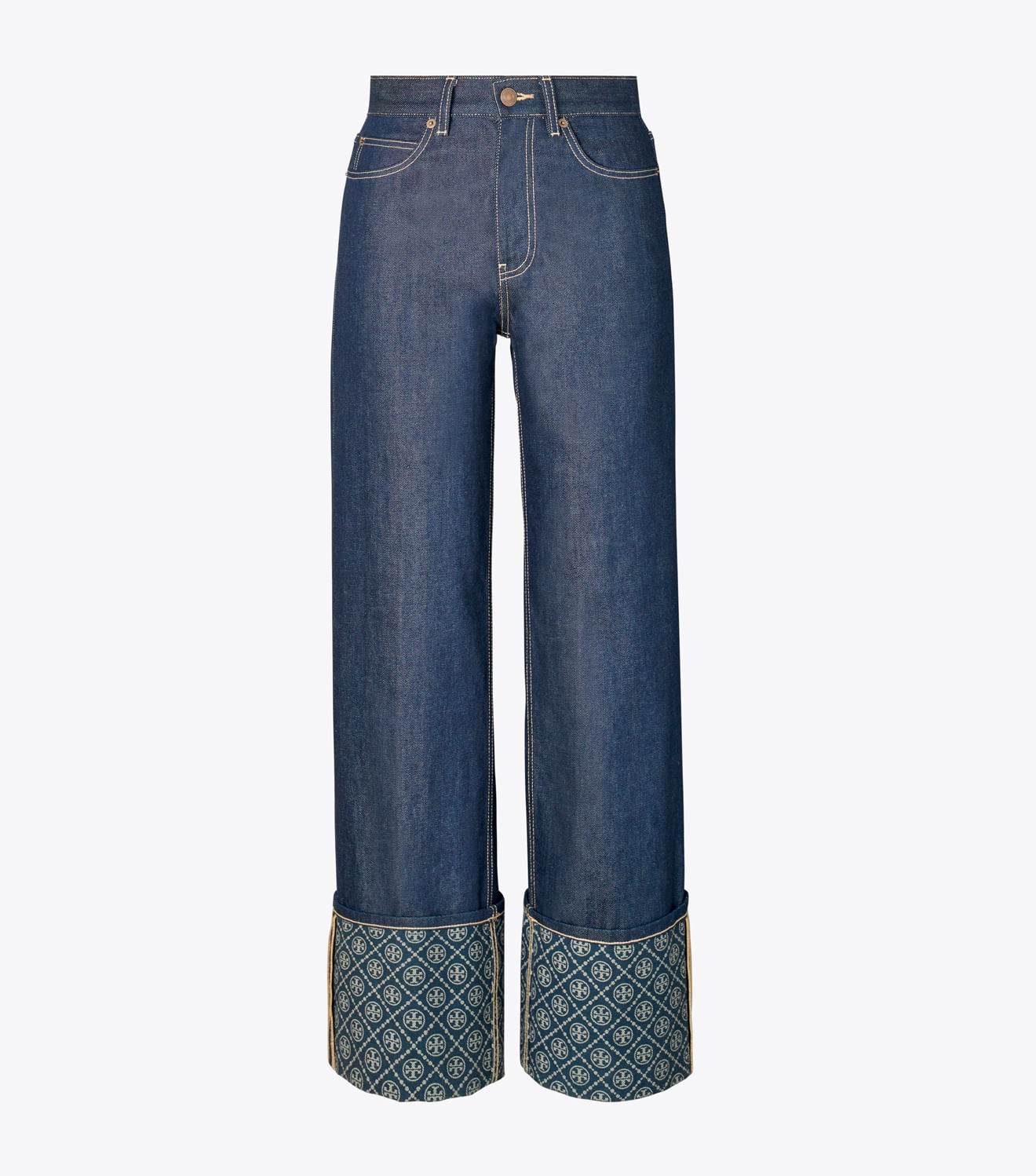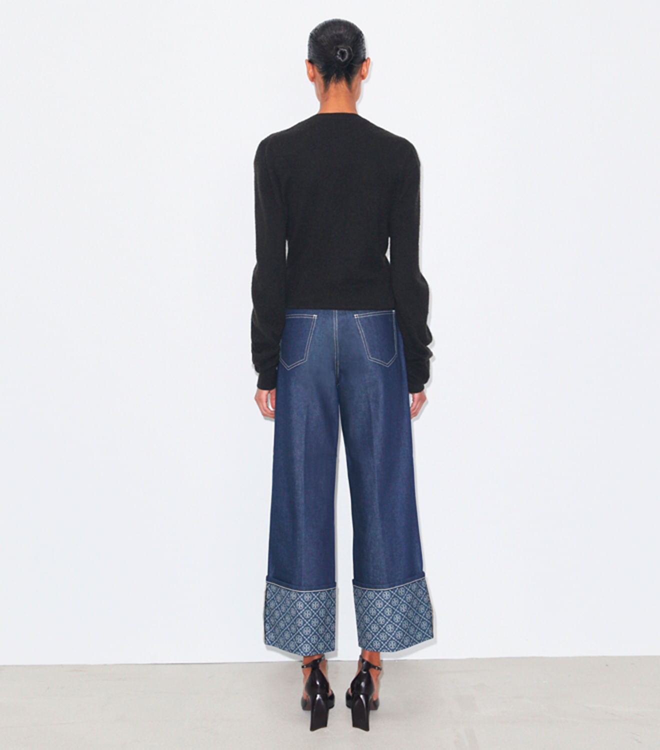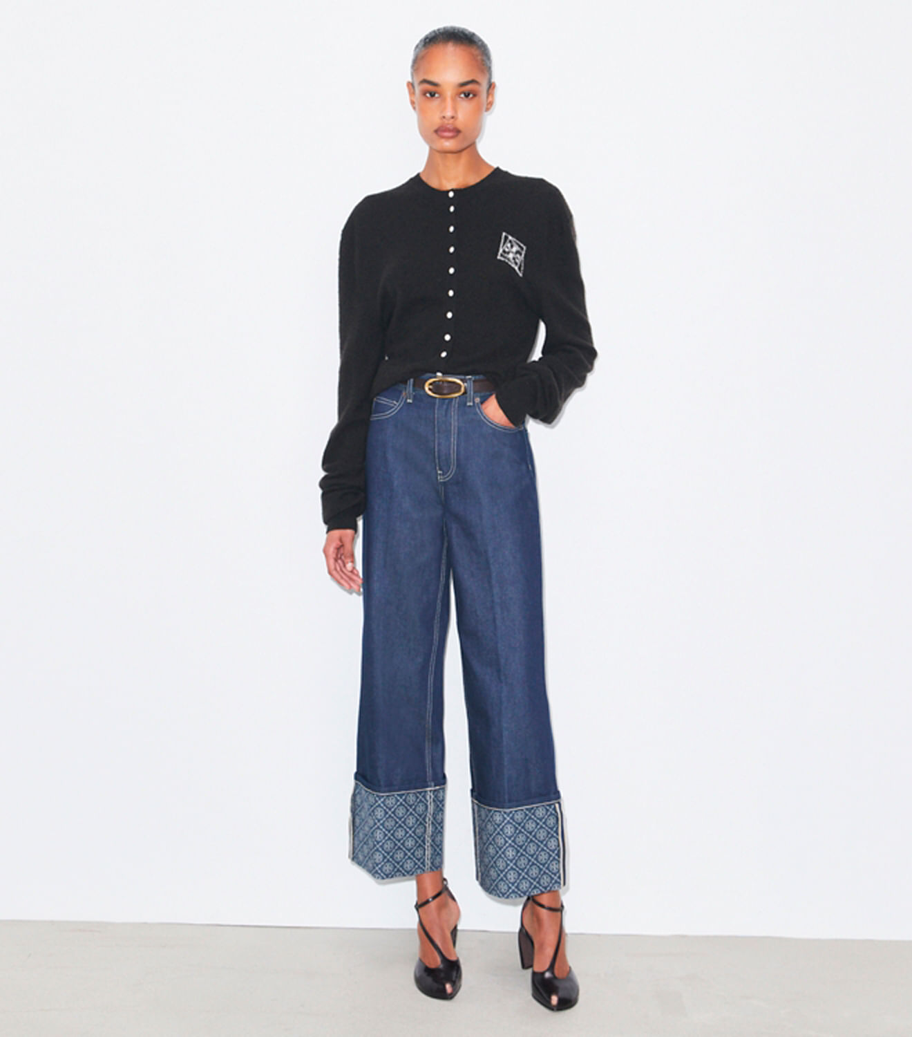 Parte da apresentação da coleção Resort 2026, explorando nossa interpretação dos arquétipos do vestuário esportivo. Aqui, uma calça jeans clássica de cinco bolsos é confeccionada em denim selvedge com corte reto e barra larga contrastante, estampada digitalmente com nosso monograma T exclusivo.