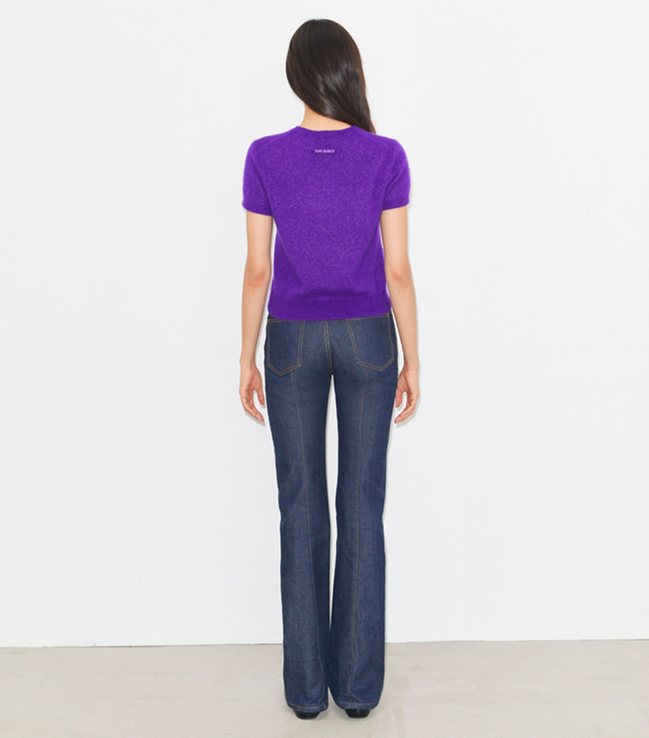 Nossa camiseta de malha fina é feita com uma mistura de cashmere e seda, com caimento levemente curto e mangas curtas. Uma peça leve e versátil para usar com as saias e calças da estação.