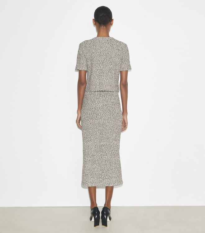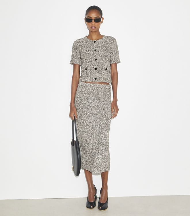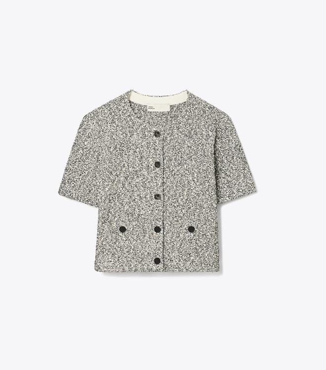 Uma versão sob medida do suéter feminino. O cardigan curto de tweed tem mangas curtas e botões de metal polido. É uma peça versátil para usar sobre tudo, de camisetas a vestidos. Combine-o com a saia combinando para um conjunto coordenado chique.