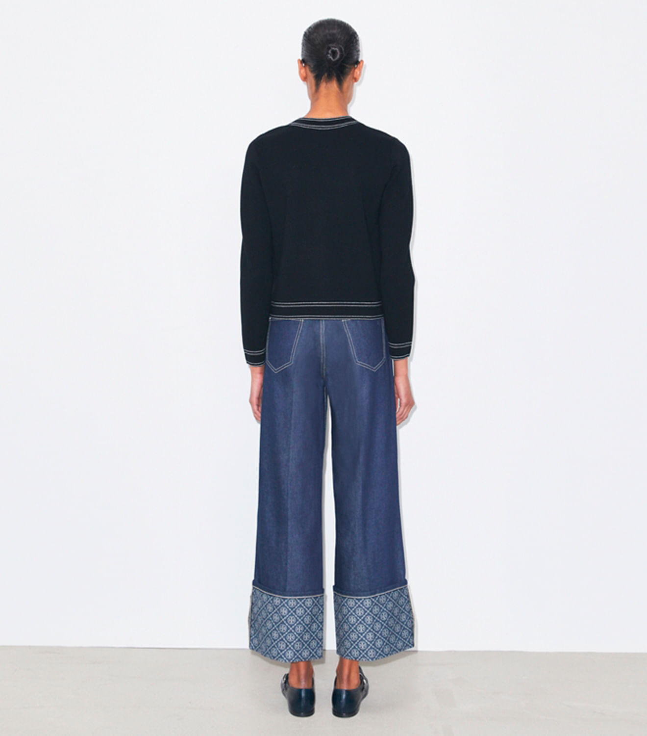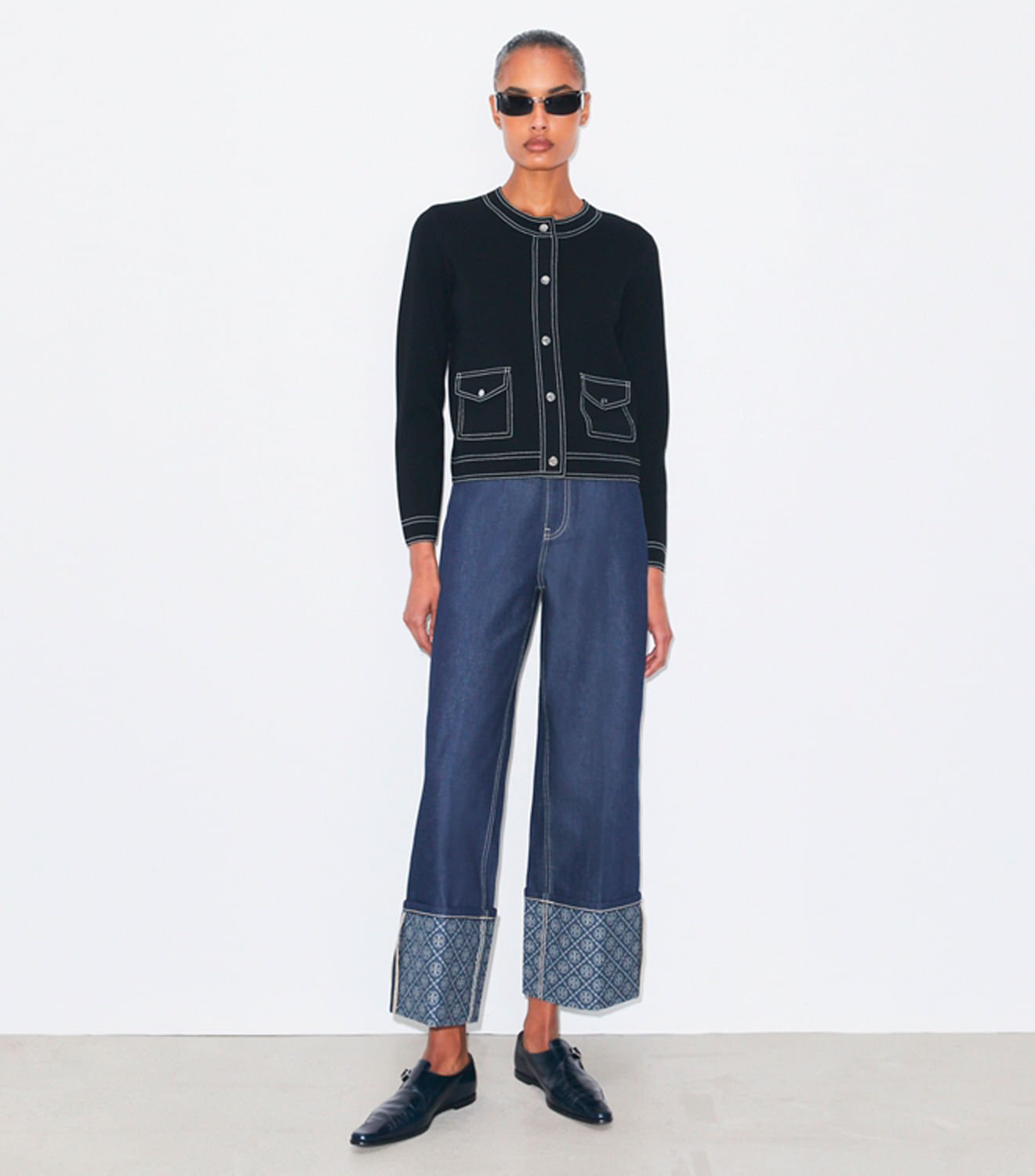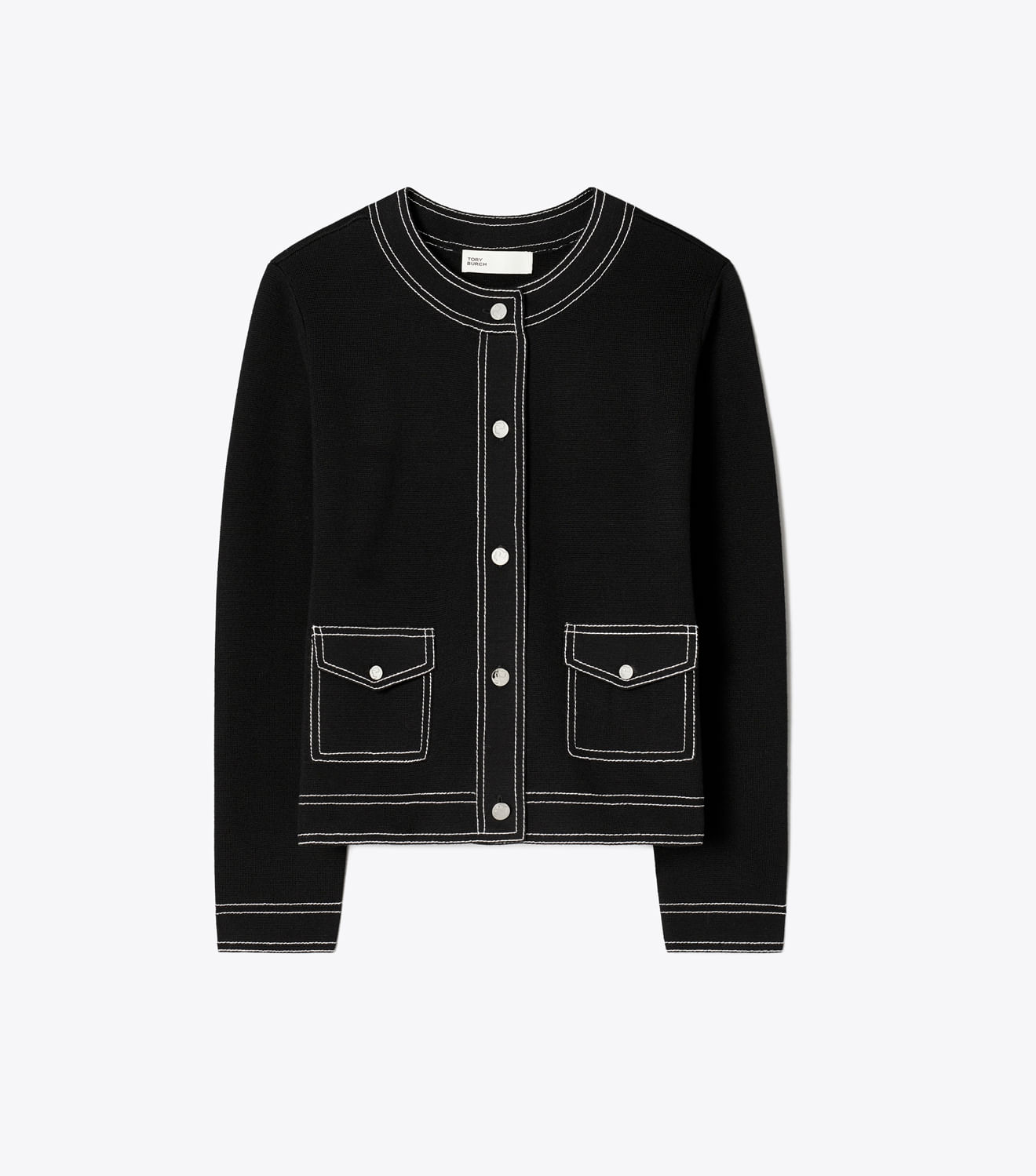 Detalhes utilitários, como costuras contrastantes e bolsos aplicados, adicionam um toque gráfico ao cardigã de lã. Combineo com a saia coordenada para uma versão casual do conjunto de saia e casaco.