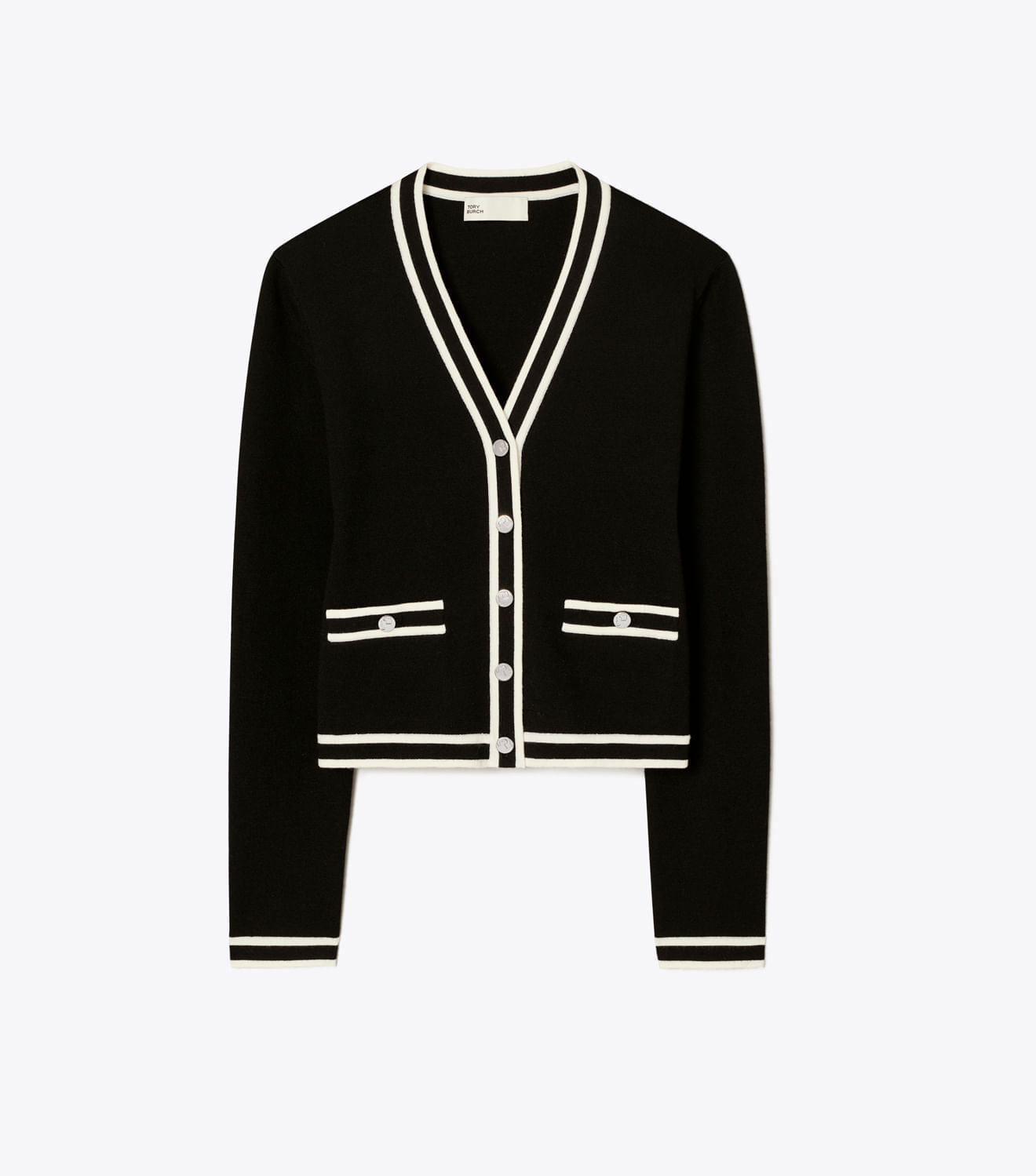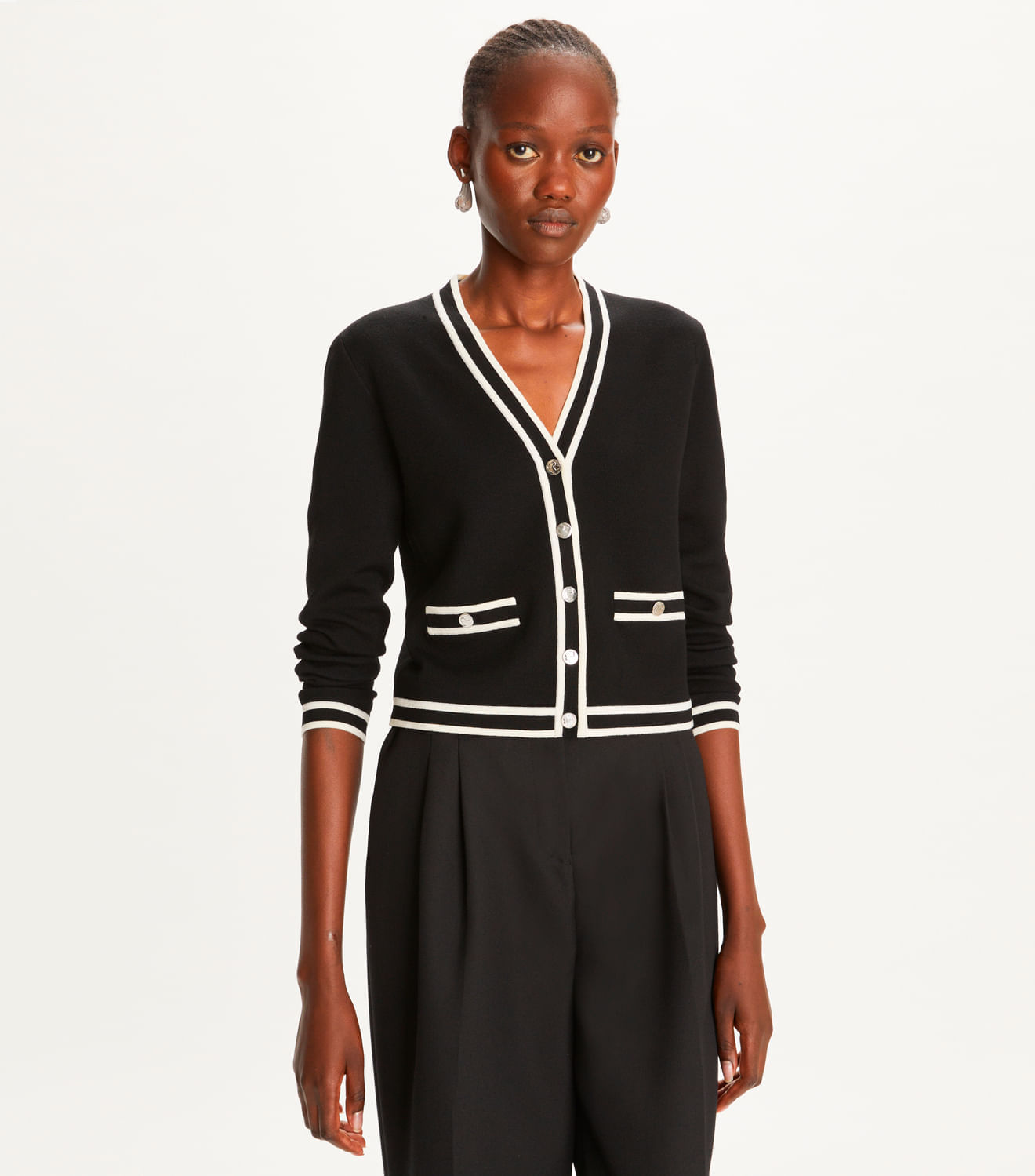 Uma versão personalizada do suéter feminino. O cardigã Kendra encurtado é tricotado em lã macia com acabamento contrastante. É uma terceira peça elegante e versátil para usar com tudo, desde camisetas a vestidos.