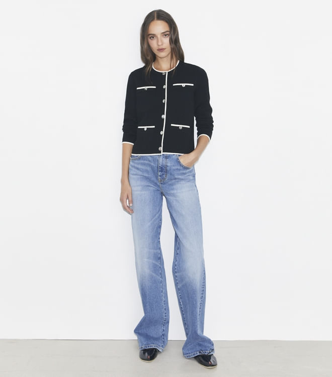 Uma versão sob medida do suéter feminino. O cardigã Kendra é tricotado em lã macia com acabamento contrastante e botões de metal polido.