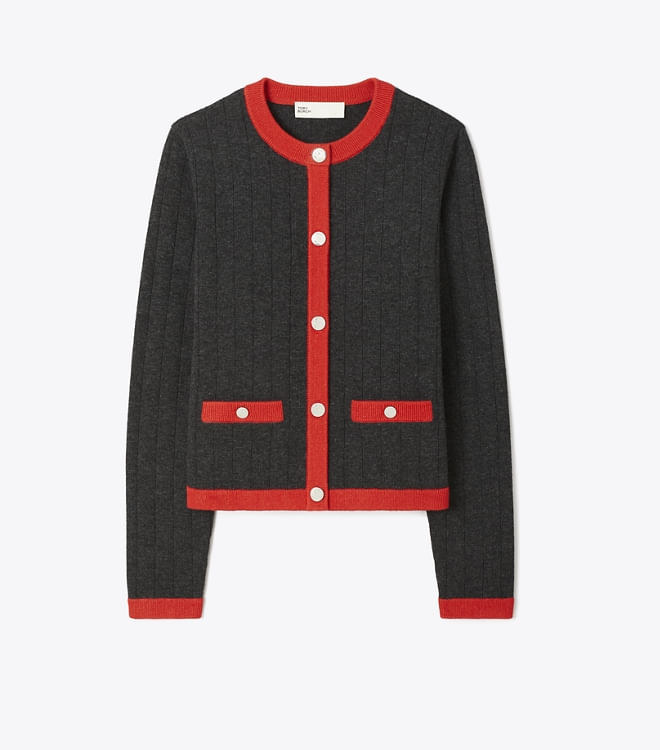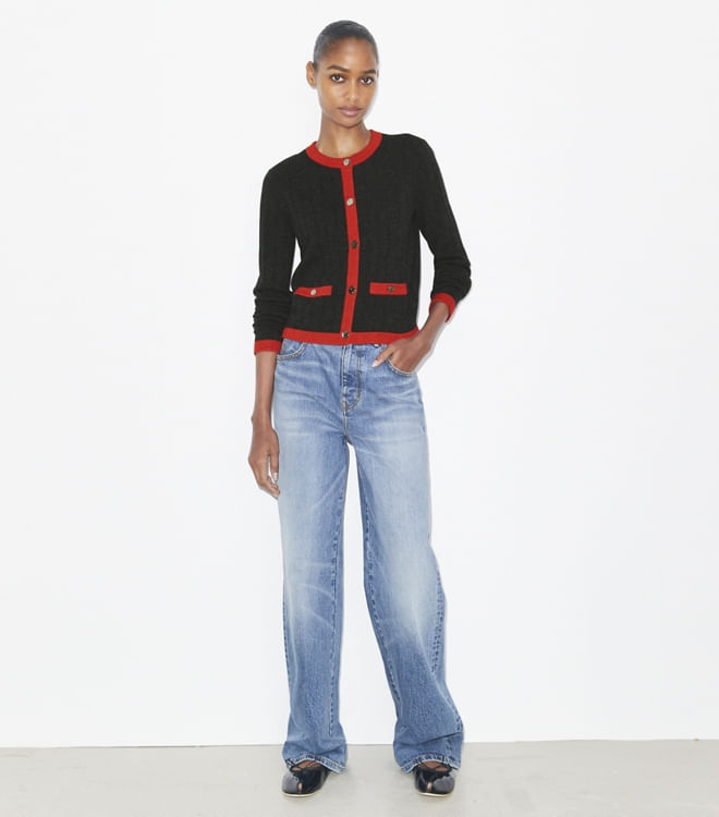O cardigan curto é tricotado com uma mistura luxuosa de lã merino e cashmere. Com acabamento contrastante e botões de metal polido, possui dois bolsos.