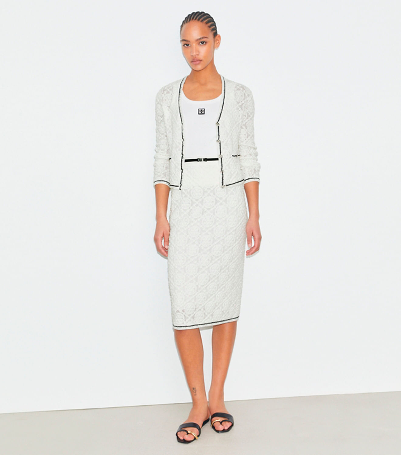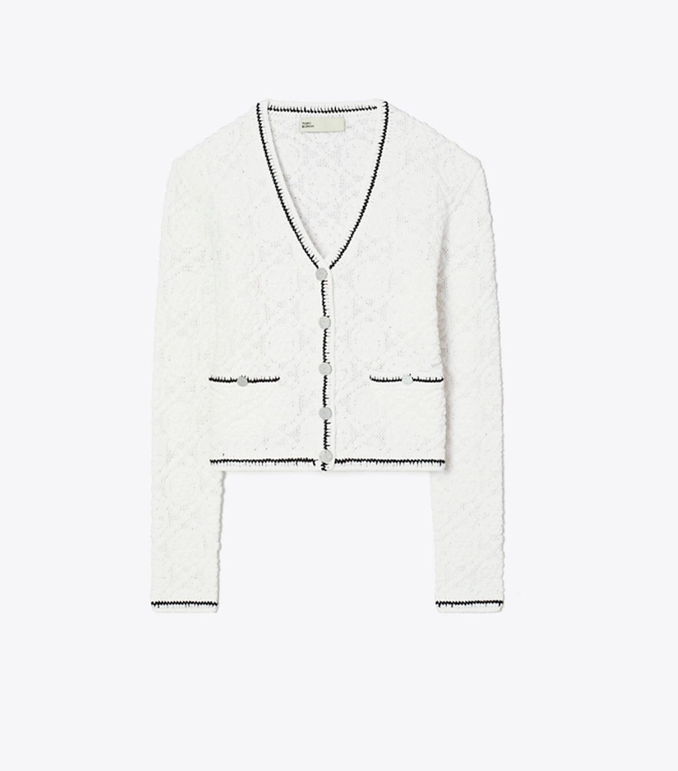 O cardigan com decote em V é atualizado com um padrão de renda que incorpora nosso motivo exclusivo, o T Monogram. Com detalhes em crochê contrastante, é uma peça leve e sutilmente gráfica para usar sobre camisetas e vestidos da estação.
