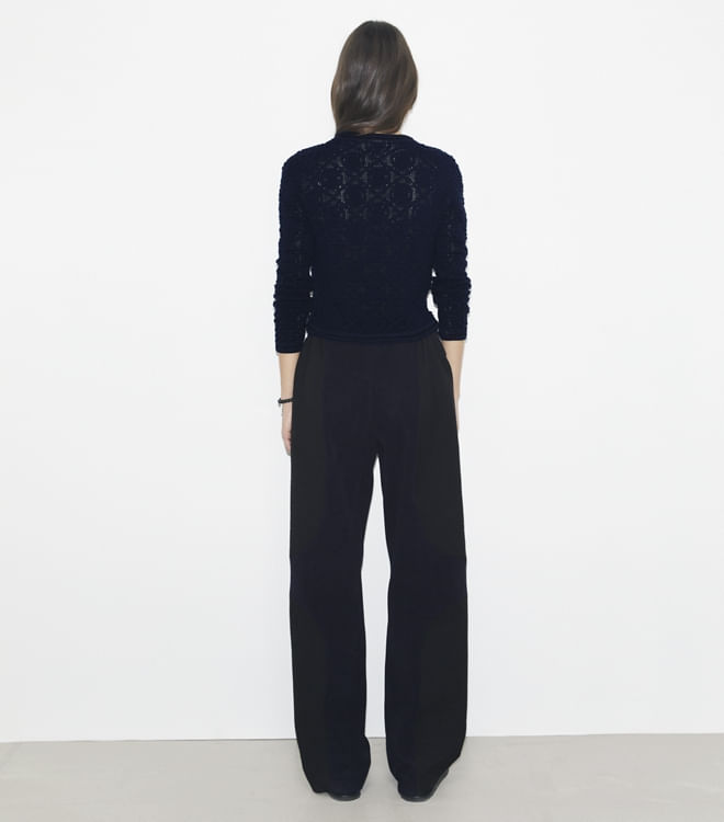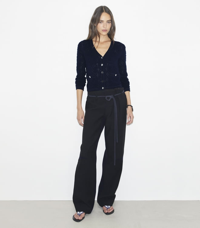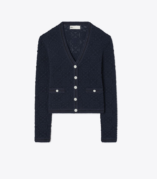 O cardigan com decote em V é atualizado com um padrão de renda que incorpora nosso motivo exclusivo, o T Monogram. Com detalhes em crochê contrastante, é uma peça leve e sutilmente gráfica para usar sobre camisetas e vestidos da estação.