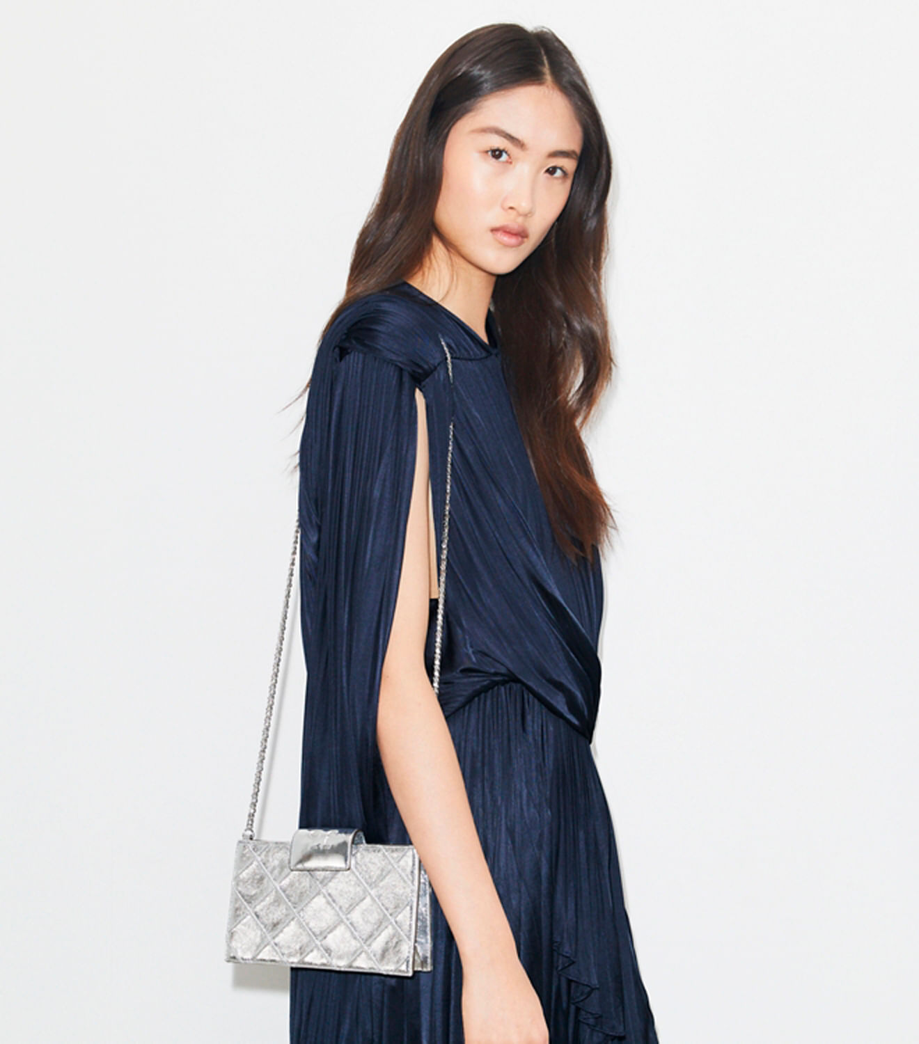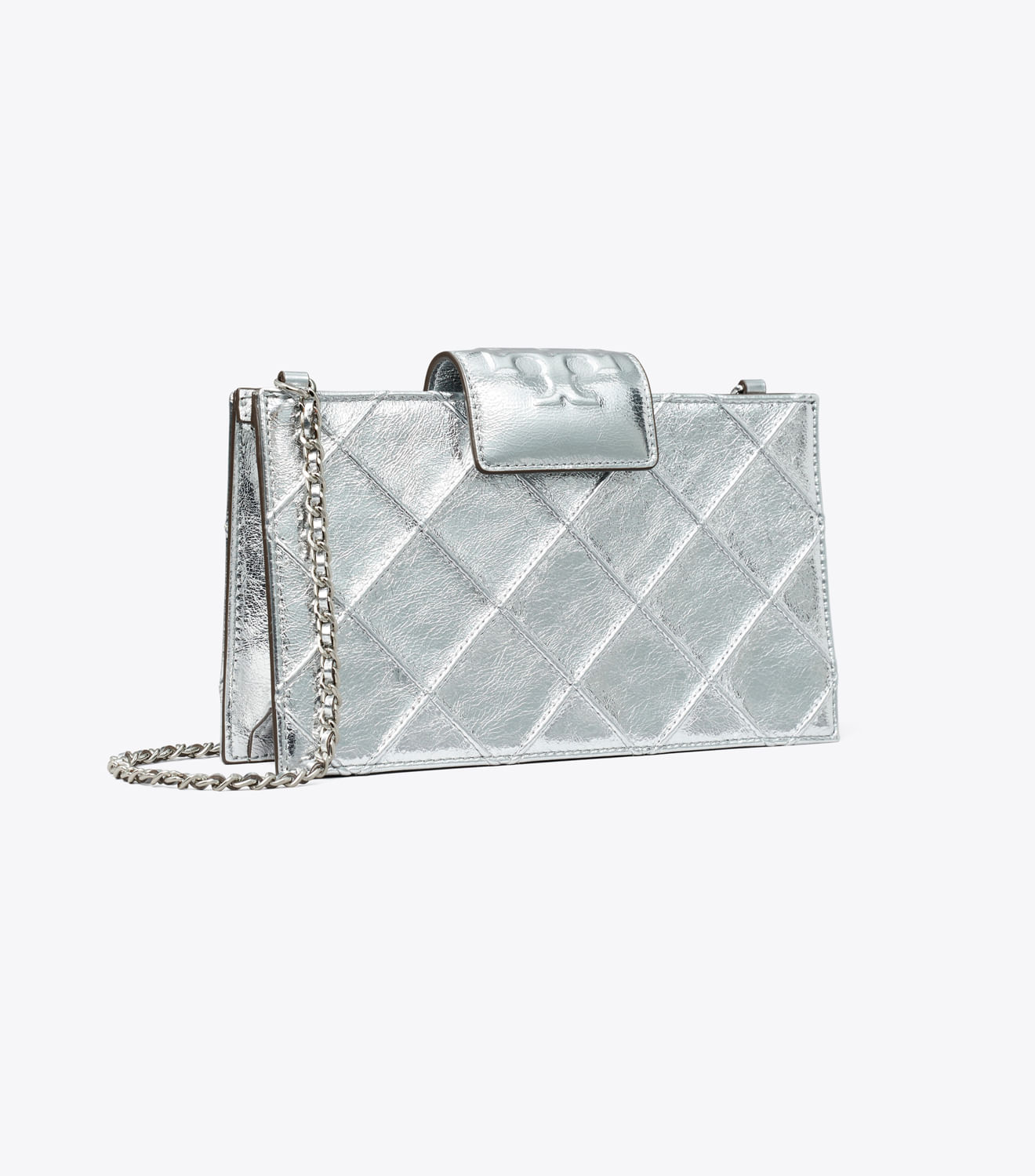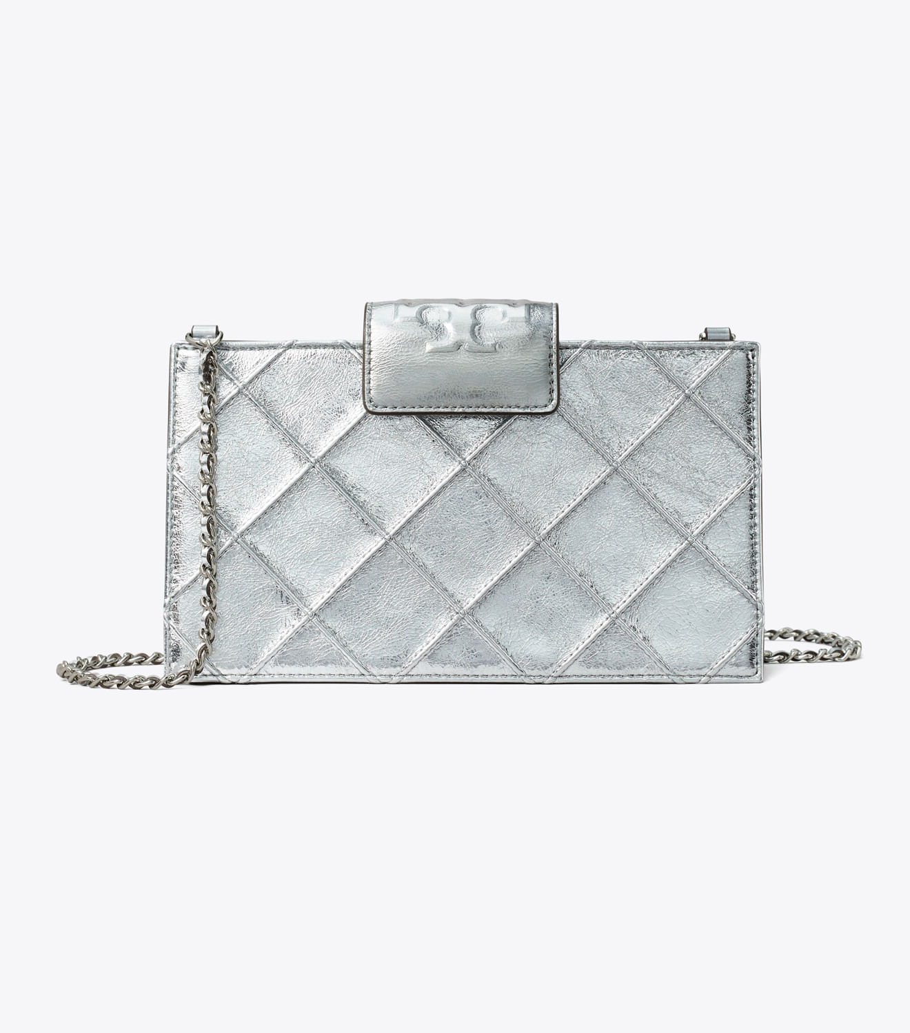 Glamour duradouro. Confeccionada em couro metálico macio, a bolsa tiracolo Mini Fleming apresenta detalhes em matelassê com padrão de losangos e uma alça de corrente trançada com detalhes em couro. Finalizada com uma aba magnética com o logotipo Double T em relevo.