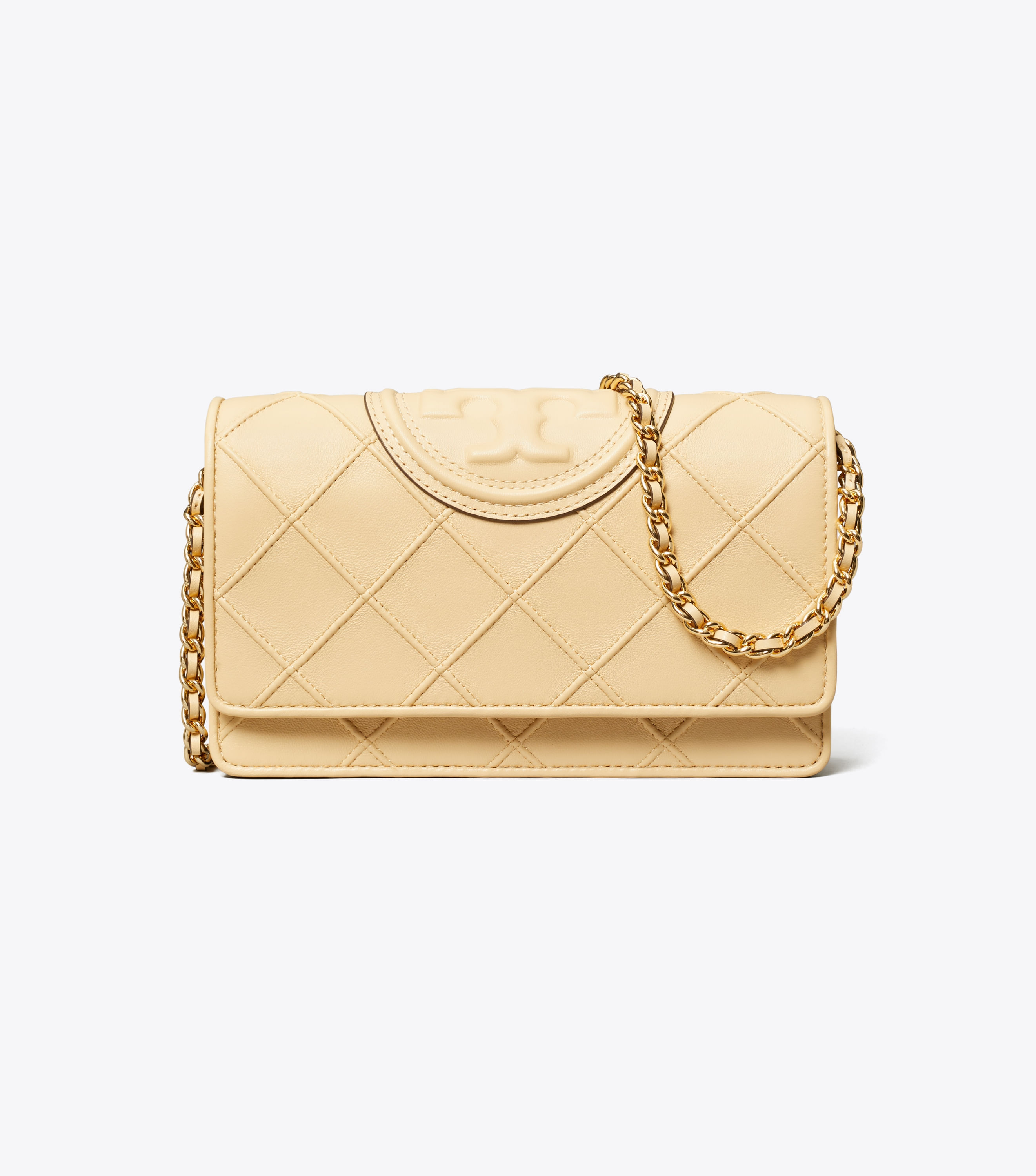 O glamour duradouro. Formatos de diamante. Corrente de metal escovado, trançada com couro. Uma silhueta feminina selada com um T duplo superdimensionado. A Carteira Fleming Soft Chain é feita do couro mais macio, com bolsos para cartões, telefone e notas inteiras.