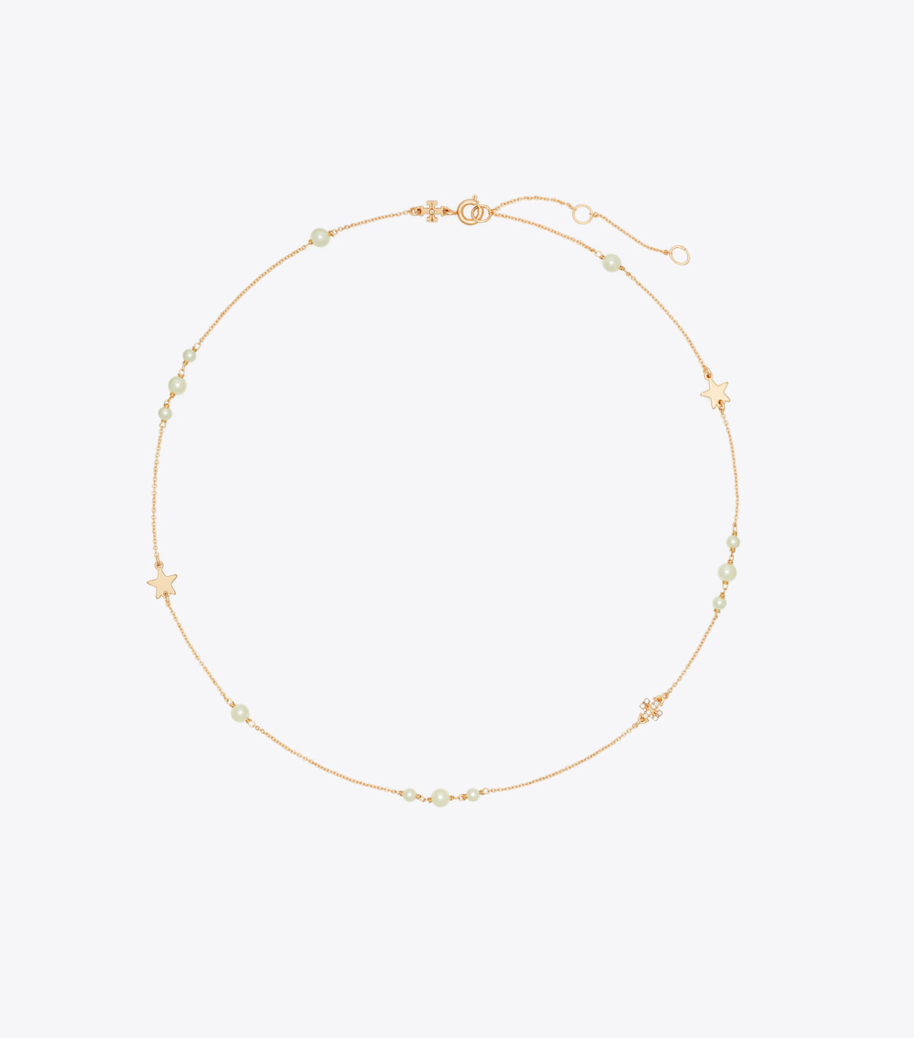 A beleza luminosa e o mistério da lua capturados em uma pérola, transmitida de geração em geração. O delicado colar com pérolas e estrelas inclui pérolas de vários tamanhos e um pingente duplo em formato de T cravejado de cristais.