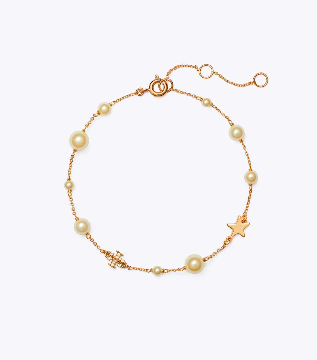 A beleza luminosa e o mistério da lua capturados em uma pérola, transmitida de geração em geração. A delicada pulseira com pérolas e estrela é desenhada com pérolas de diversos tamanhos e um logotipo Double T cravejado de cristais.