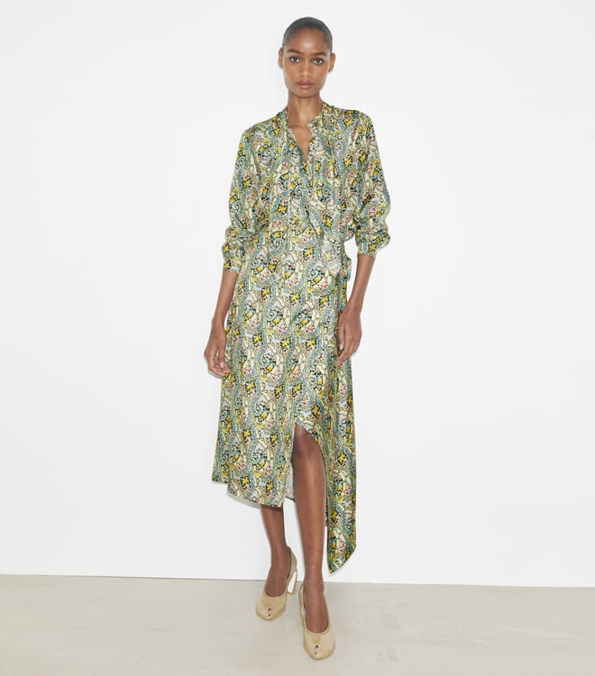 Nossa saia envelope de seda tem um corte assimétrico em A com amarrações de fita na cintura. A estampa paisley abstrata é baseada em uma amostra têxtil do século XIX. Uma peça versátil, que também pode ser combinada com a camisa da mesma cor para um conjunto completo.