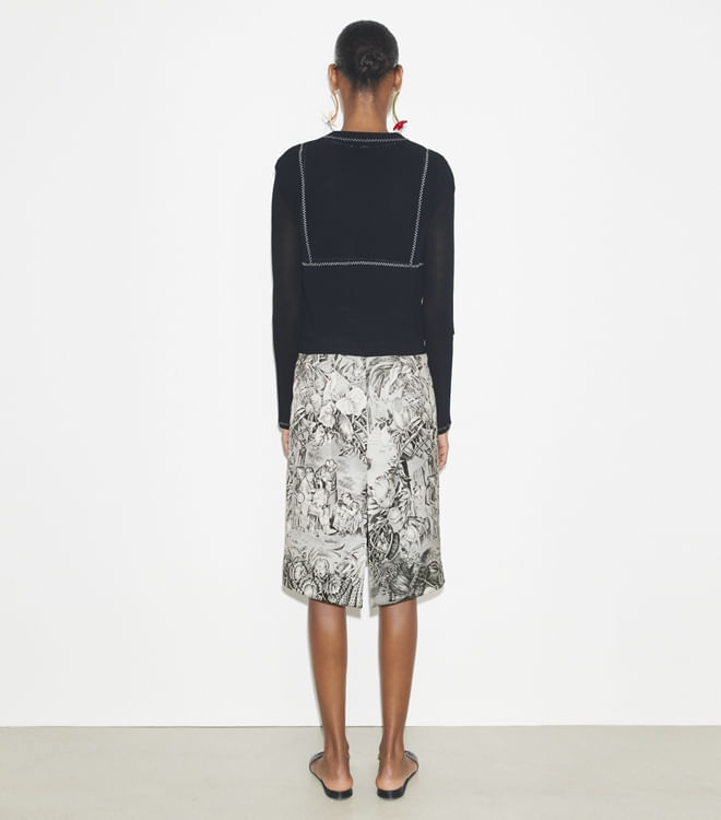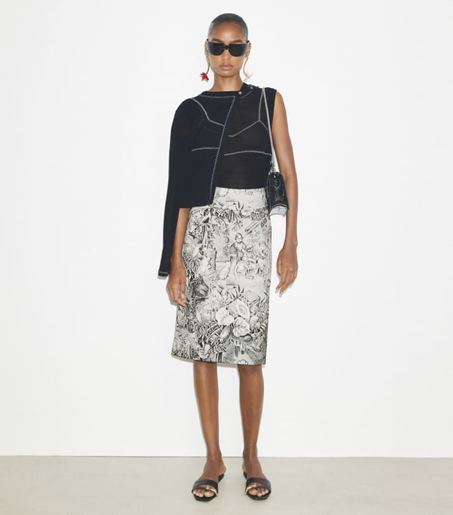 A saia estampada de viscose tem comprimento médio e fenda nas costas para facilitar os movimentos. Nossa estampa Alien é inspirada nos tradicionais tecidos franceses toile de Jouy.