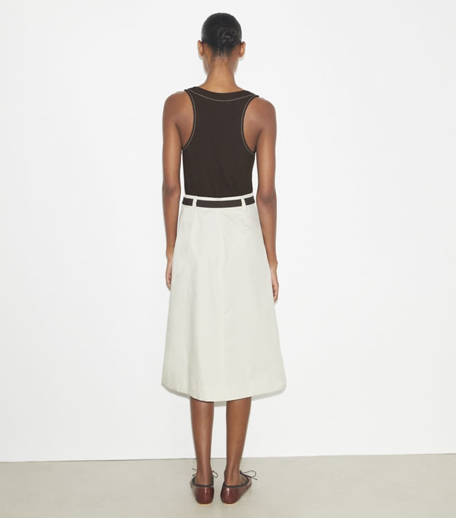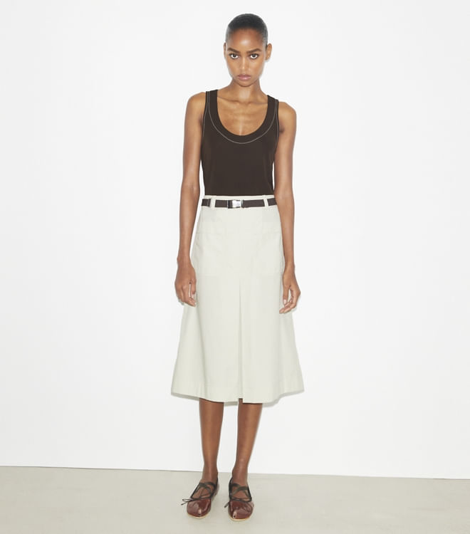 Uma peça essencial para o clima quente, esta saia de algodão prática tem um corte em A discreto e cai logo abaixo do joelho. Pregas frontais, bolsos aplicados e um cinto removível com fecho de pressão rápido completam o estilo com um toque esportivo.