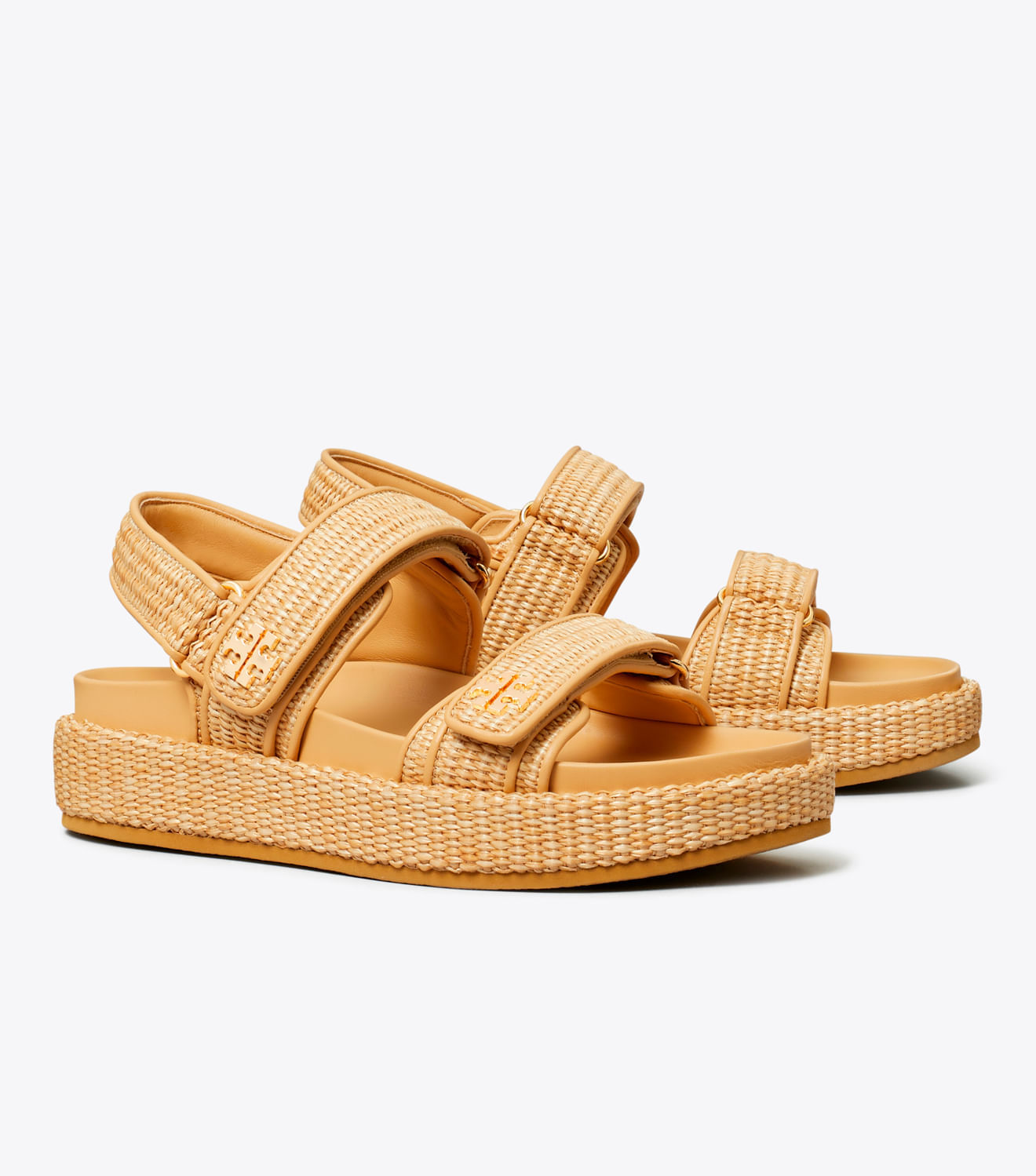 Para uso diário e noturno, a sandália combina uma silhueta prática com detalhes sofisticados. Nossa sandália Kira Sport combina ráfia e náilon com uma palmilha de couro moldado ultraconfortável e solado de borracha. As tiras utilitárias de velcro são detalhadas com nosso logotipo exclusivo.