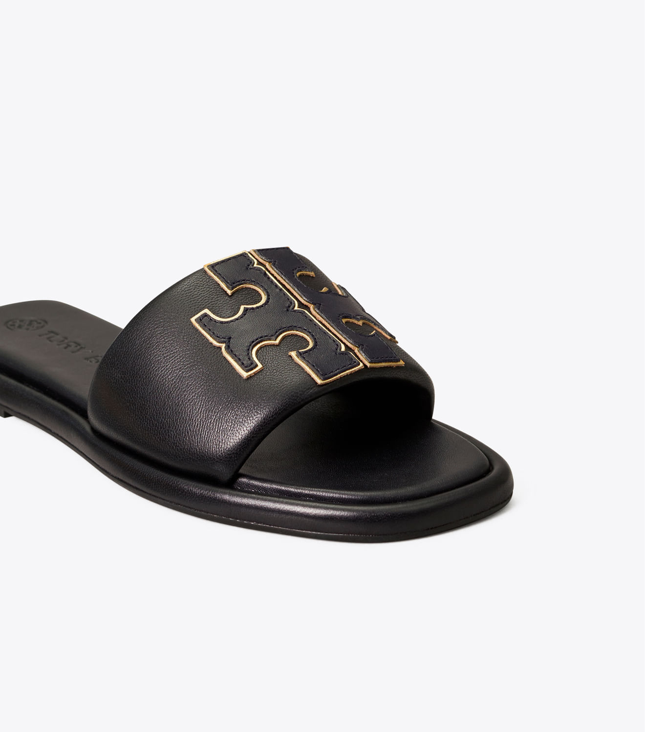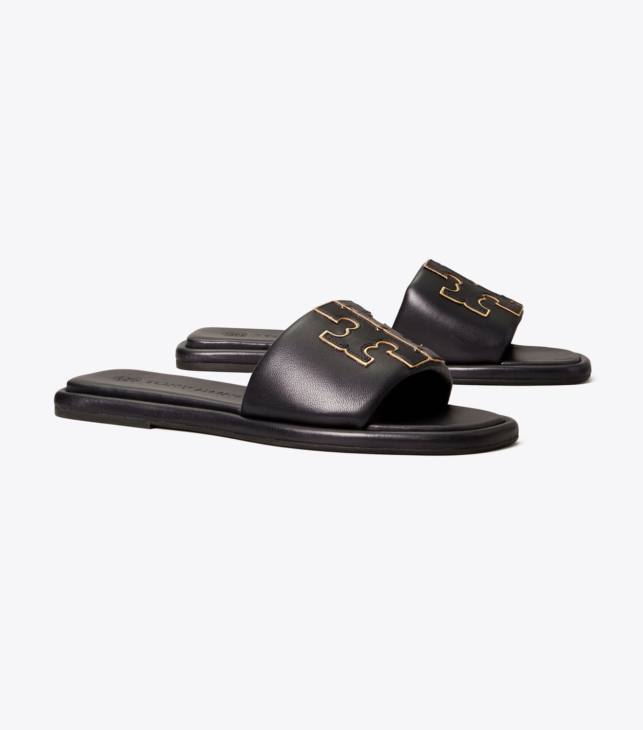 Conforto chique. O slide esportivo é feito de couro macio acolchoado que envolve o pé, com uma palmilha de espuma acolchoada para suporte flexível. O Double T em relevo tem acabamento metálico para um brilho sutil.