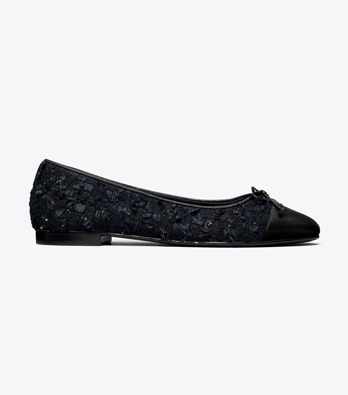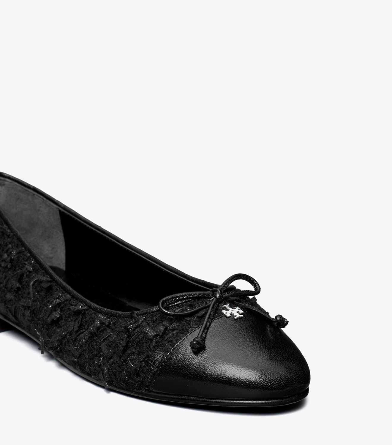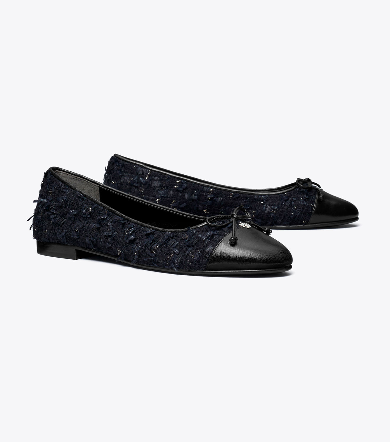 Uma sapatilha clássica combina tweed bouclé de inspiração retrô com uma biqueira contrastante, criando uma mistura sutil de cores e texturas. O estilo elegante é finalizado com um delicado laço e o logotipo Double T.