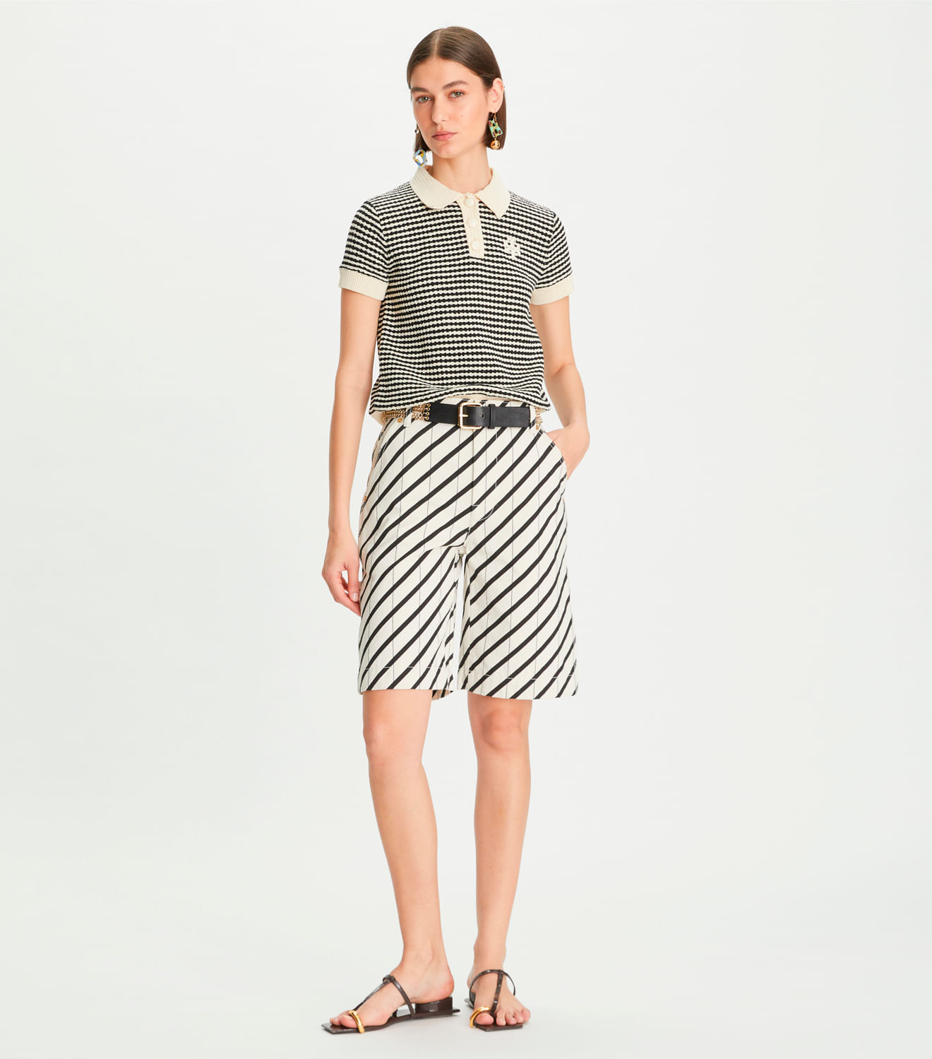 Nosso shorts listrado decanvas é inspirado no vestuário de trabalho e combina detalhes utilitários com listras gráficas. A sarja de algodão italiano é cortada para um ajuste confortável e espaçoso. Useo com a polo de crochê para um visual de verão no suéter.