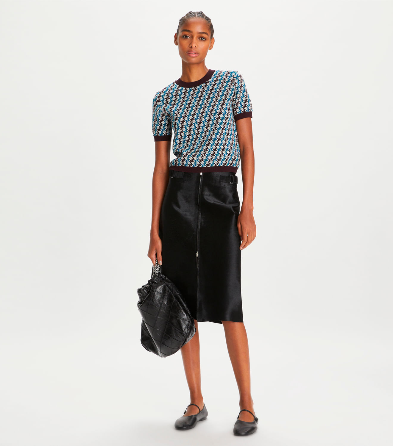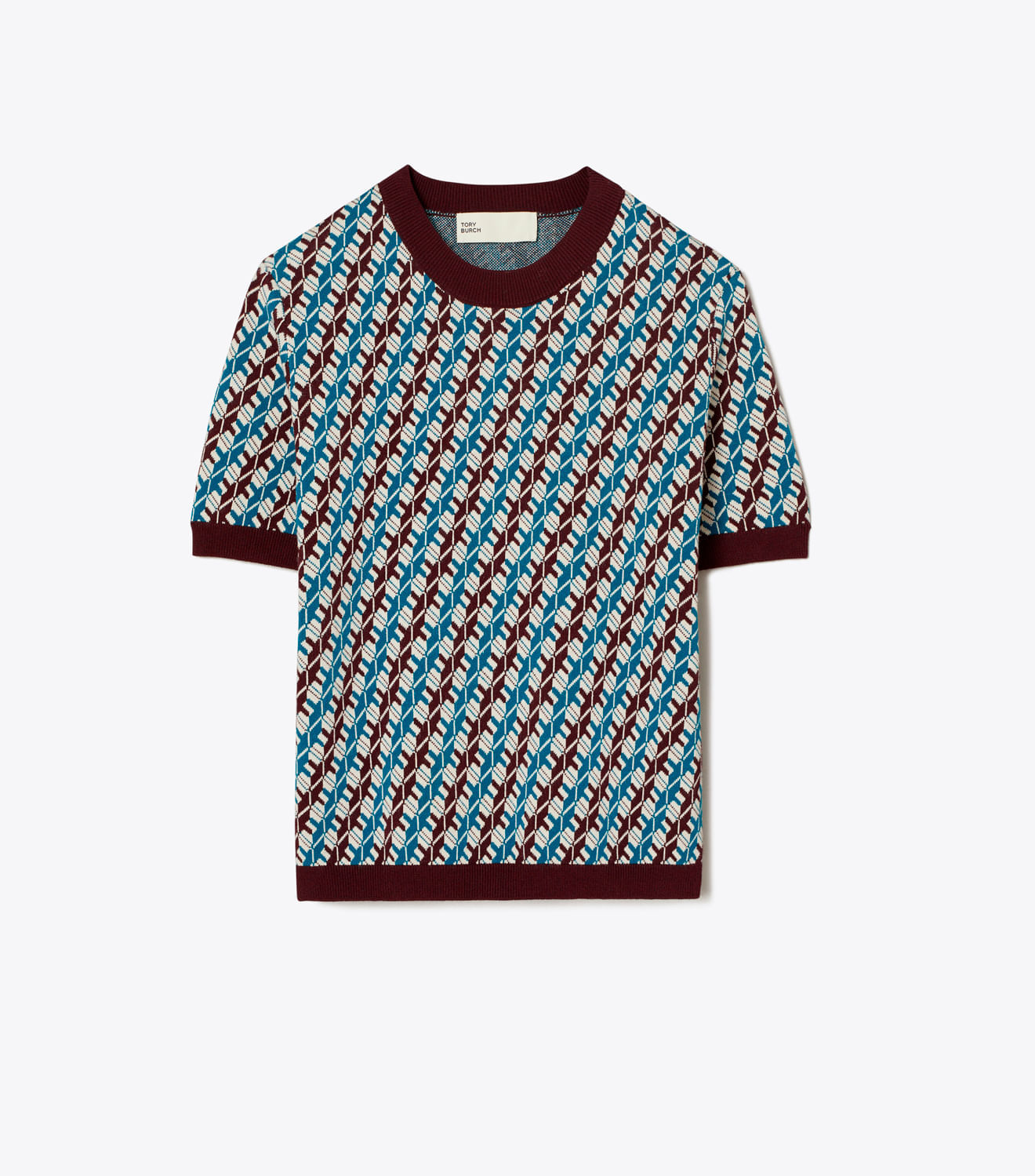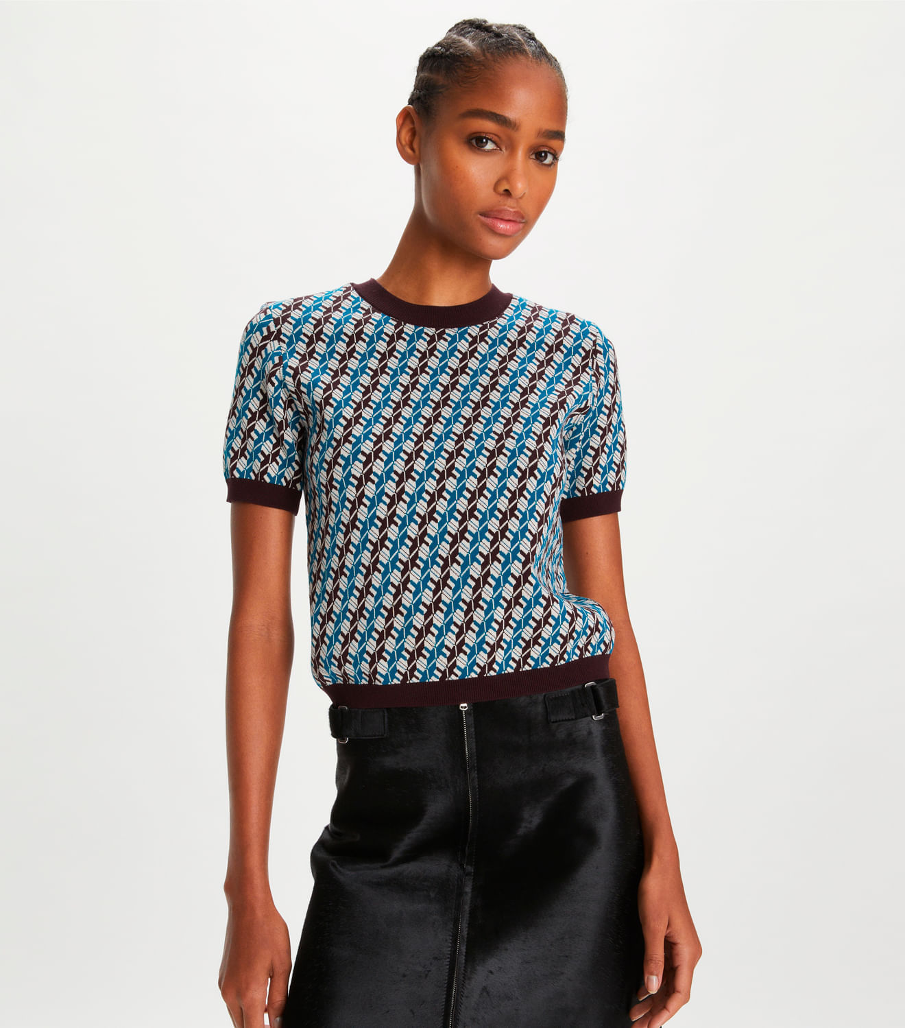 Um suéter de jacquard de manga curta apresenta uma estampa geométrica ousada e uma gola, punhos e bainha em malha canelada contrastante. O top refinado é finalizado com um laço de ponto corrente no pescoço. Para um estilo simplificado de inspiração vintage, use-o com o mini short combinando.