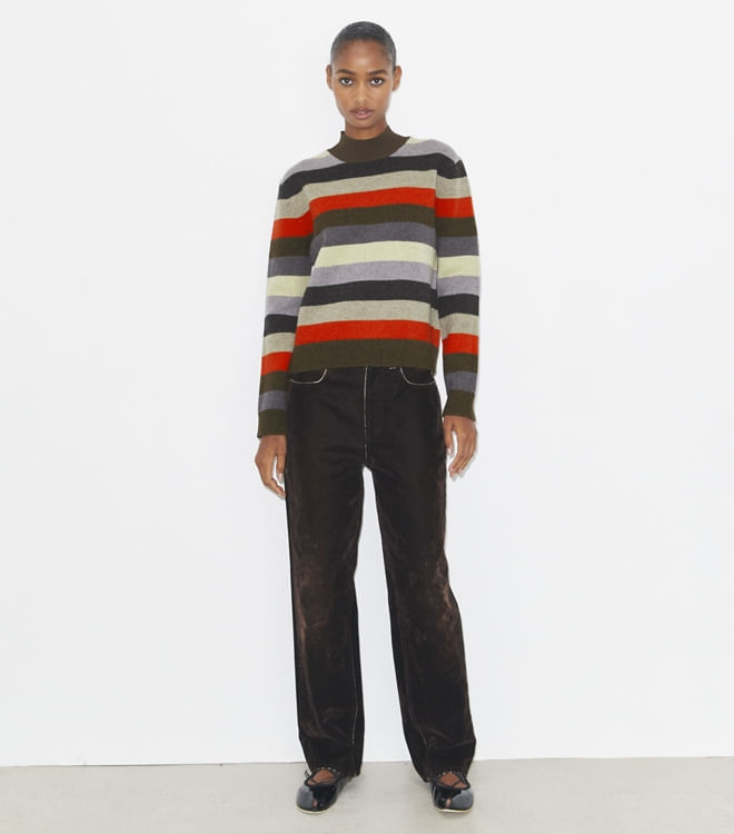 Uma peça essencial para o frio, o suéter de gola alta é confeccionado com listras terrosas e caimento soltinho. Confeccionado em lã merino quentinha.