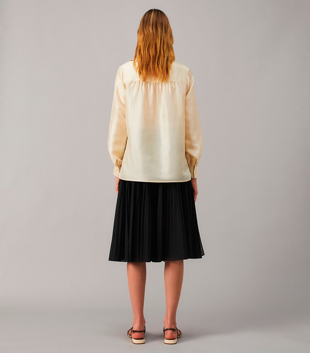 Uma das primeiras silhuetas que criamos, a túnica é atualizada para a estação em gazar de seda italiana leve, com decote aberto. Use a blusa universalmente elegante por dentro de jeans de cintura alta ou com uma saia justa e franzida, como mostrado na passarela.