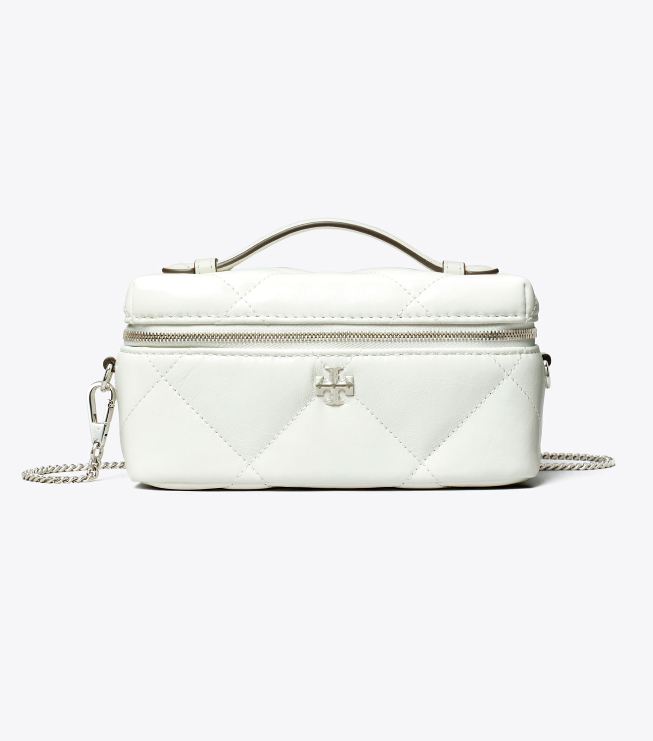 Couro irresistivelmente macio com costura em formato de diamante em relevo e uma textura sutilmente desgastada. Formato acolchoado realçado por detalhes metálicos com o logotipo Double T chanfrado. A bolsa Kira Diamond Quilt Vanity Case é uma versão mini do estilo clássico, que está em alta. Usea pela alça superior ou com a alça transversal removível adornada com pingentes.