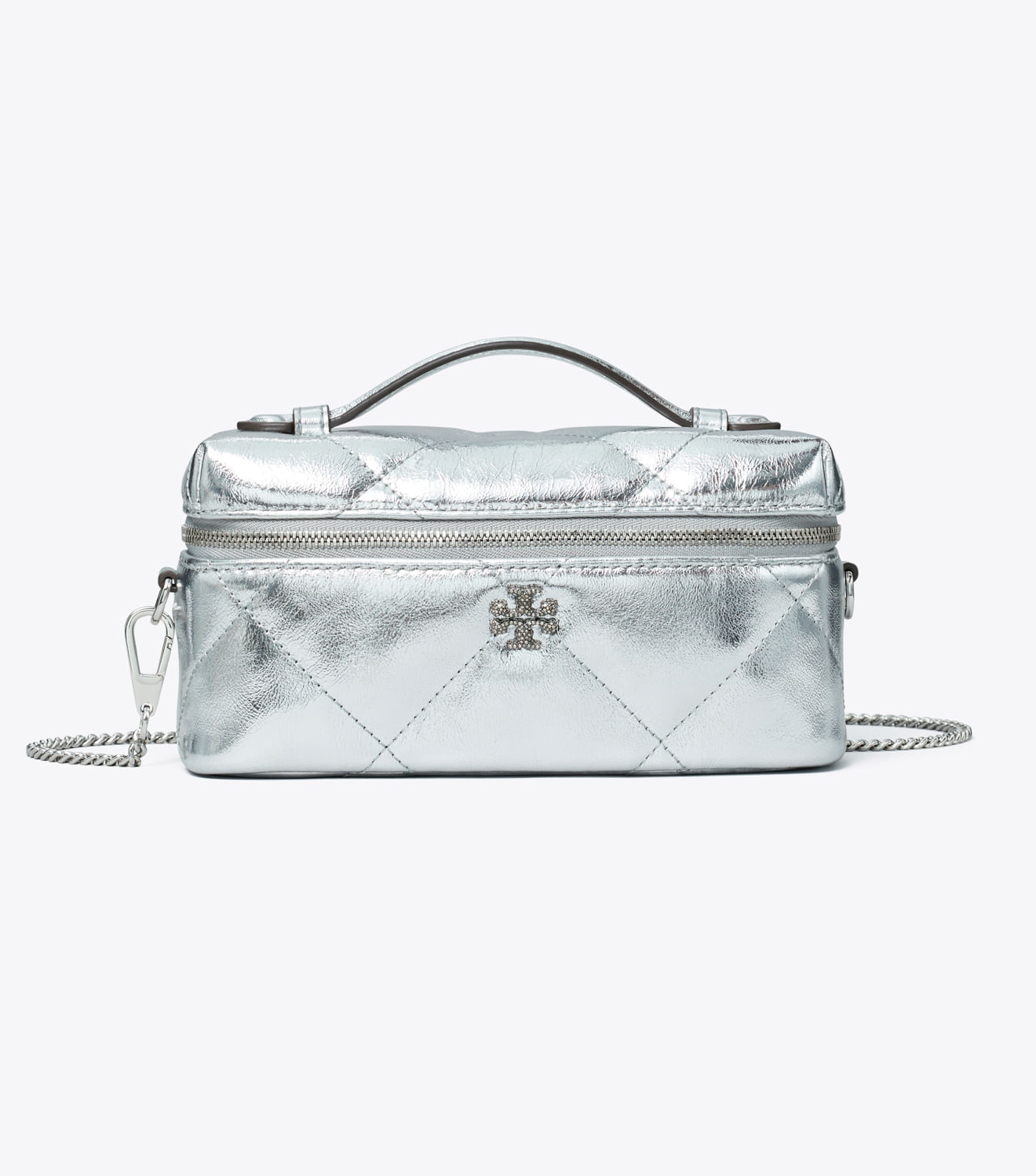 Couro italiano irresistivelmente macio com costura em formato de diamante em relevo. Design acolchoado com detalhes em metal com o logotipo Double T chanfrado. A bolsa Kira Diamond Quilt Metallic Vanity Case é uma versão mini do estilo clássico, que está em alta. Pode ser carregada pela alça superior ou com a alça transversal removível.