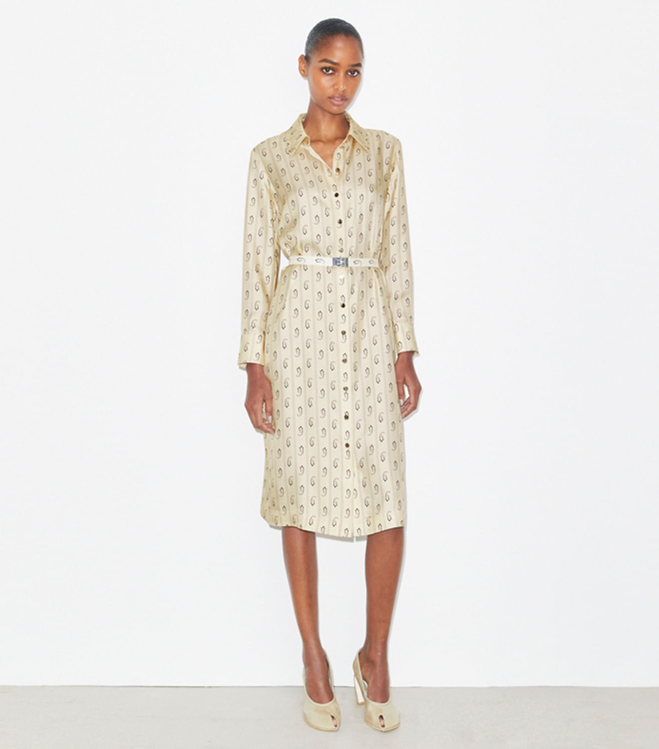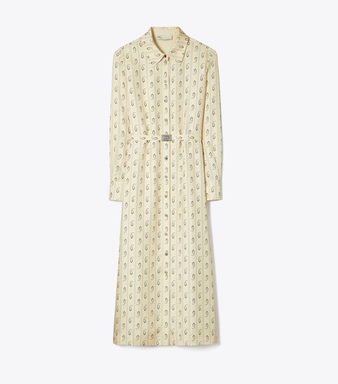 O vestido-camisa estampado é feito de sarja de seda, tem caimento fácil e cintura marcada. Feminino. Descomplicado. Fácil de vestir para um look mais formal ou casual.