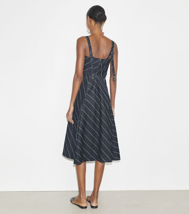 Feito de uma mistura de algodão e linho, o vestido de comprimento médio é fresco, leve e respirável. Uma peça elegante para usar sozinho ou em camadas.
