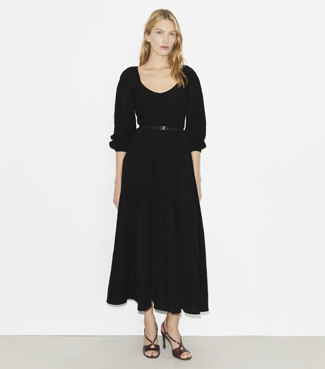 Simples e versátil, o vestido de linho apresenta um decote em V elegante, bolsos laterais e cinto removível. Uma peça perfeita para usar de diferentes maneiras.