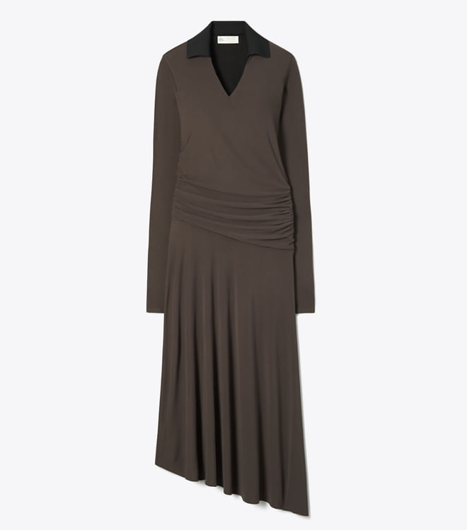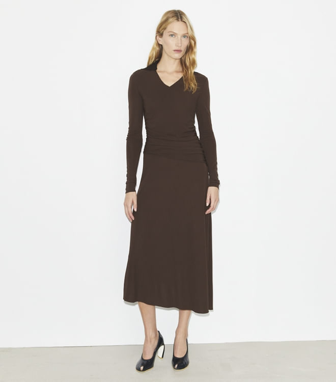 Confeccionado em jersey de viscose com ótima estrutura e elasticidade, o vestido com decote em V conta com cintura franzida e gola removível. Ultraversátil e resistente a amassados, é uma opção elegante para o trabalho e pode ser facilmente guardado em viagens.