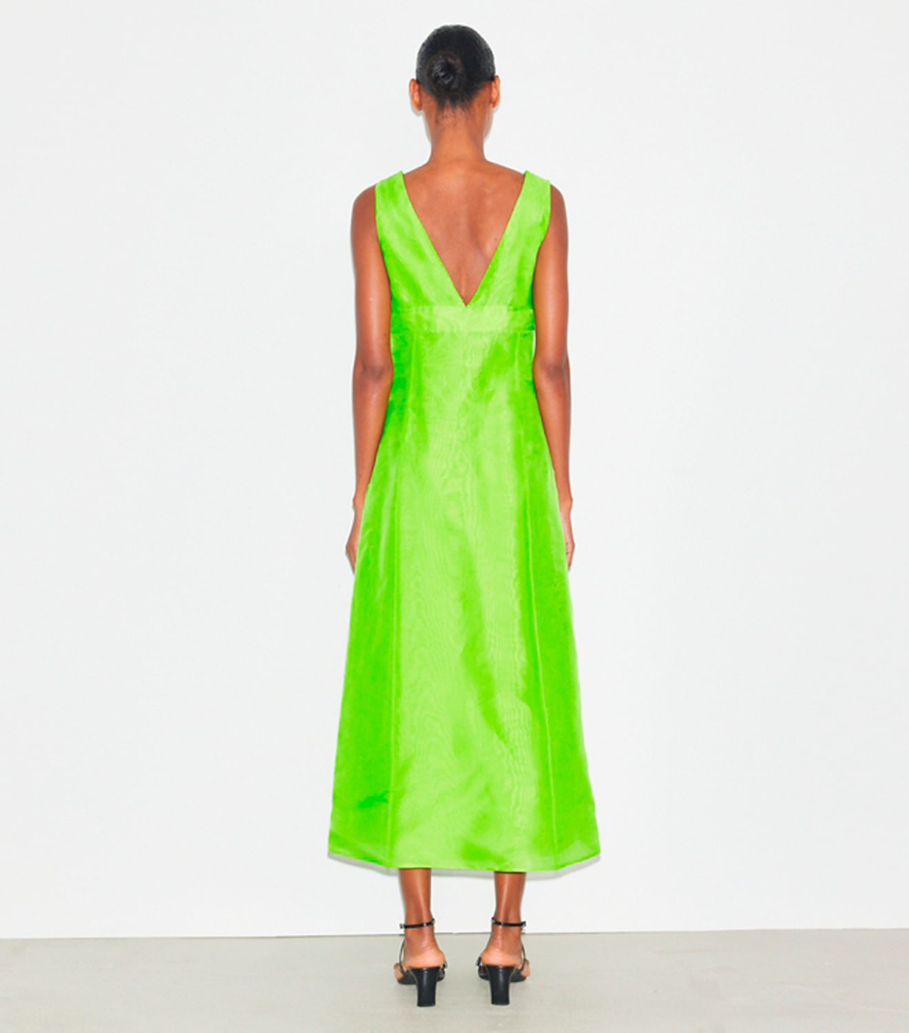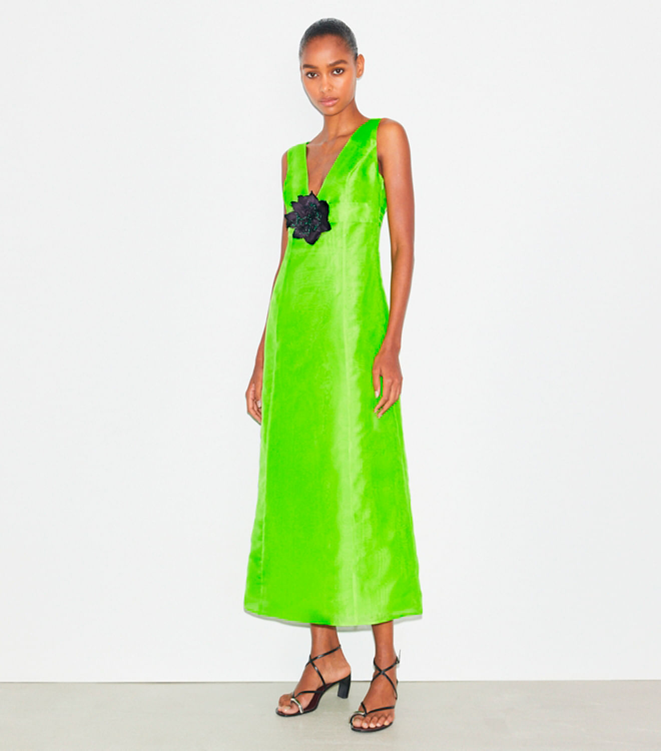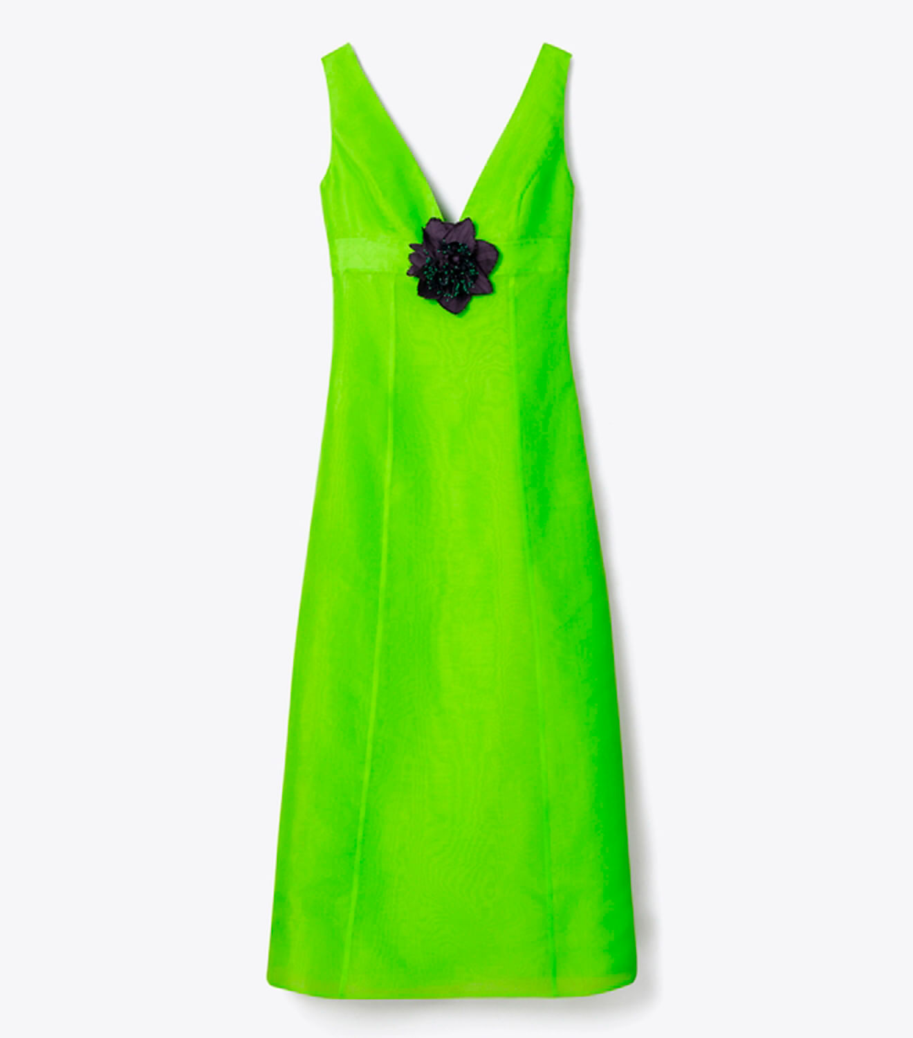 Confeccionado em organza de seda vibrante, o vestido sem mangas tem uma silhueta clássica adornada com um broche de flor removível. Uma peça versátil para usar em looks mais formais ou informais.