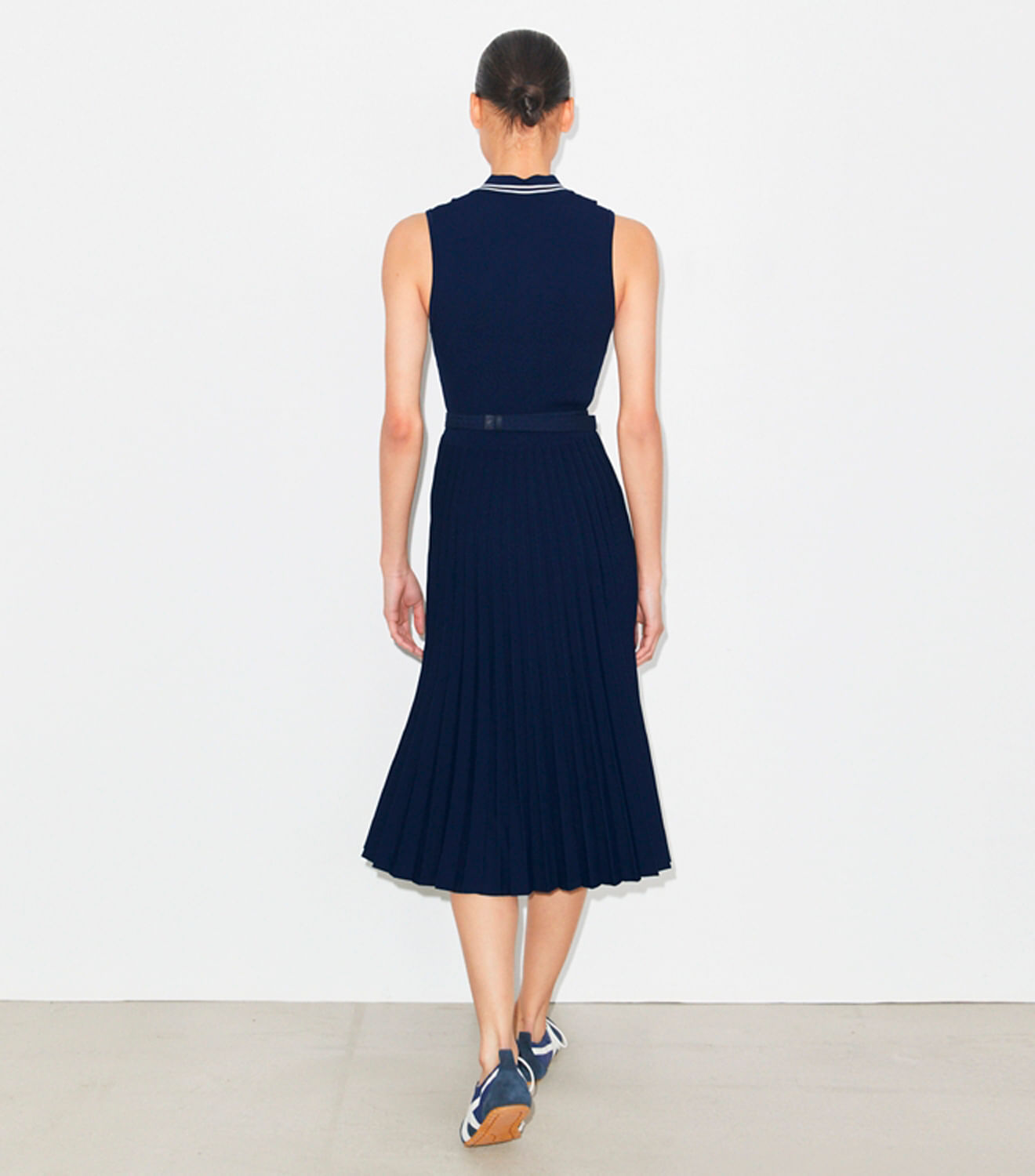 Este vestido polo sem mangas tem um corte com a parte superior ajustada e uma saia longa plissada. Confeccionado em viscose com uma ligeira elasticidade, a silhueta refinada é finalizada com uma gola canelada contrastante e um cinto elástico removível com fivela de encaixe rápido.