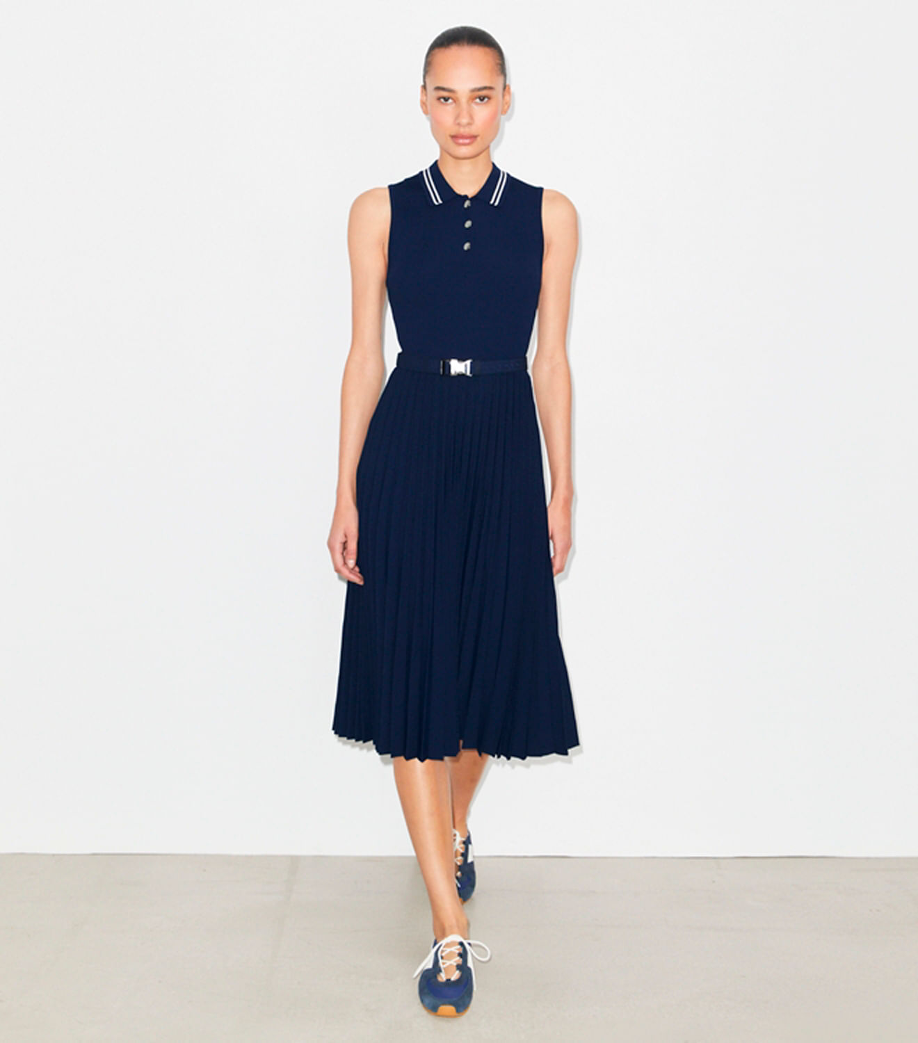 Este vestido polo sem mangas tem um corte com a parte superior ajustada e uma saia longa plissada. Confeccionado em viscose com uma ligeira elasticidade, a silhueta refinada é finalizada com uma gola canelada contrastante e um cinto elástico removível com fivela de encaixe rápido.