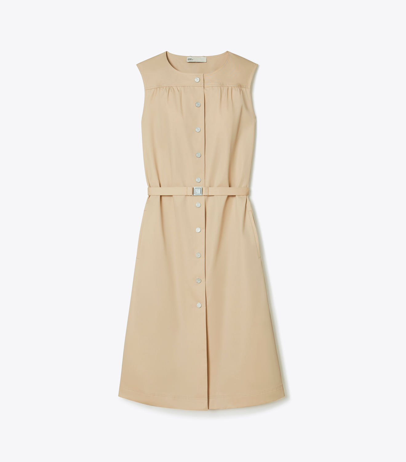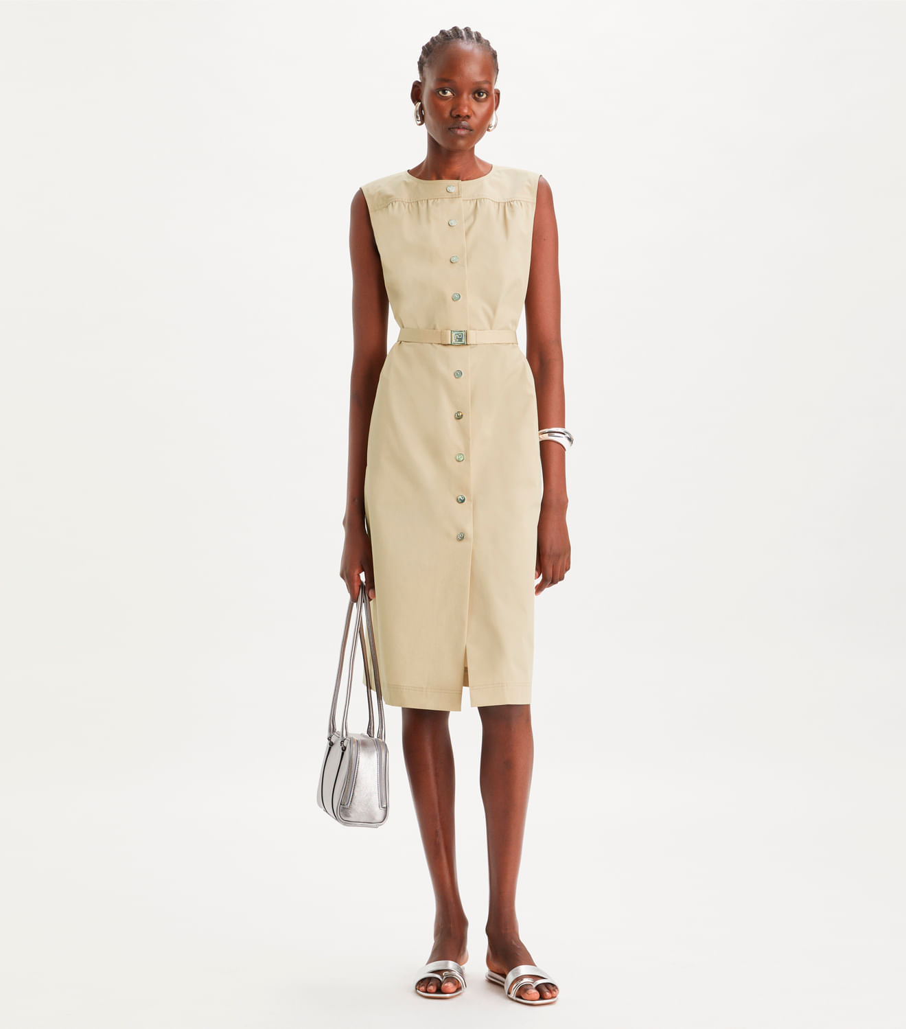 Nosso vestido de botão de popeline de algodão é universalmente elegante, com um ajuste relaxado e silhueta de decote canoa. Use-o com ou sem o cinto elástico combinando. Perfeito para o trabalho, fins de semana e tudo mais.