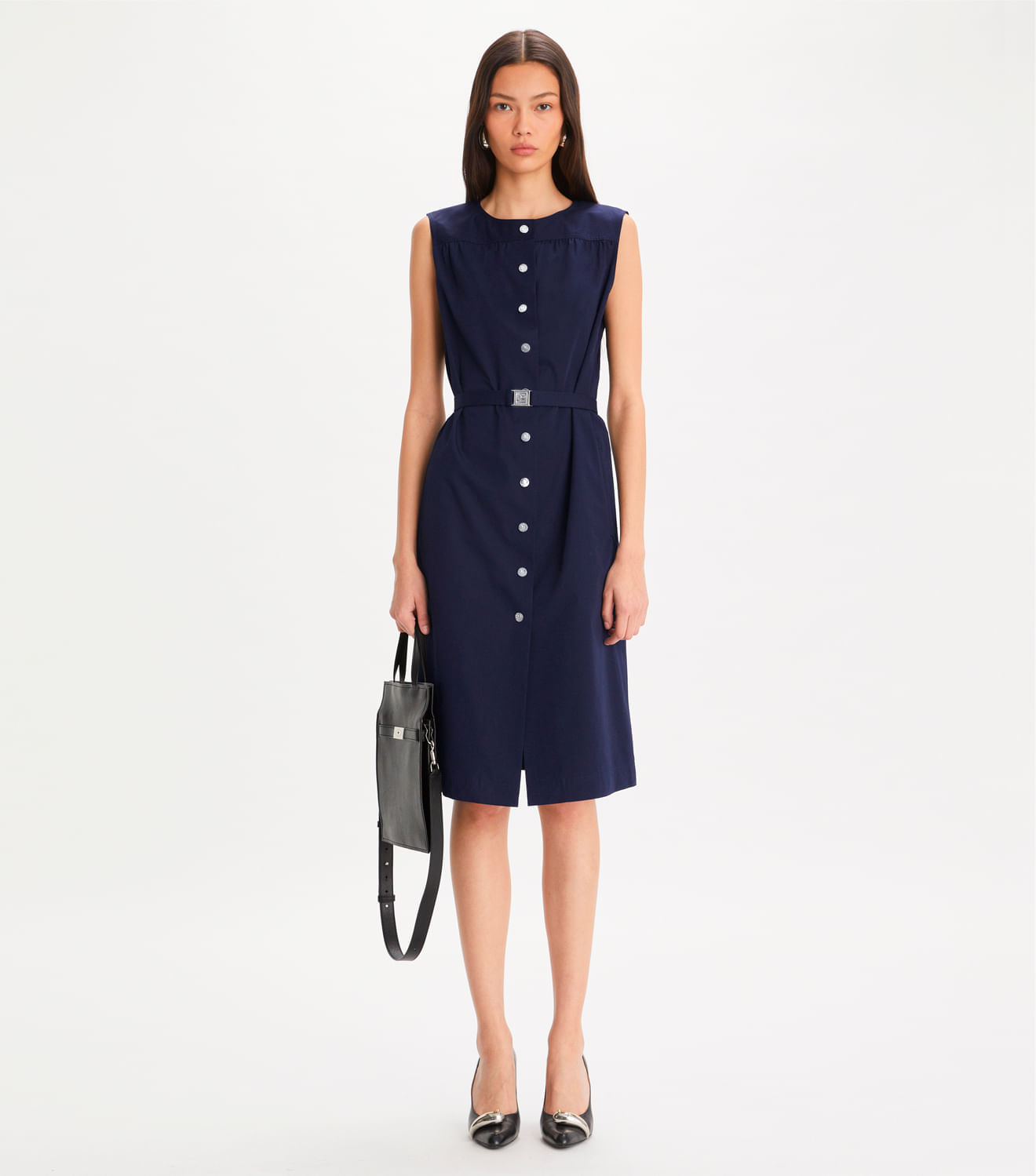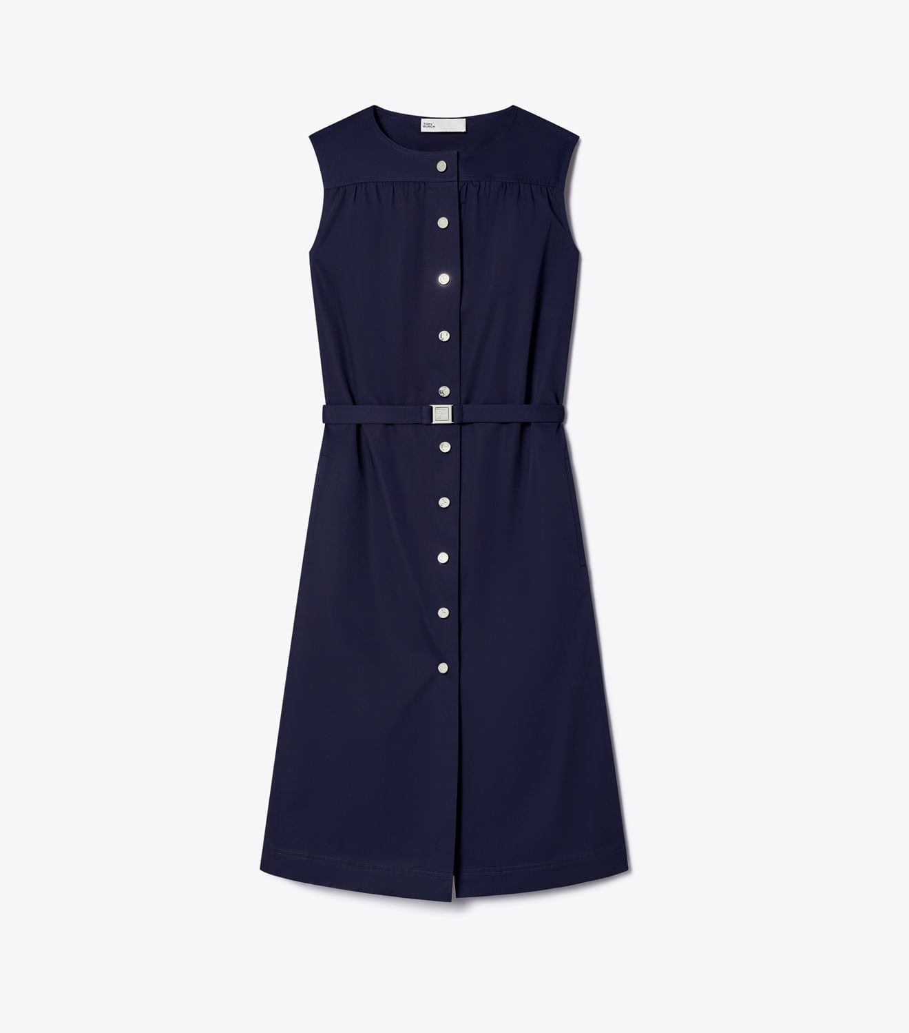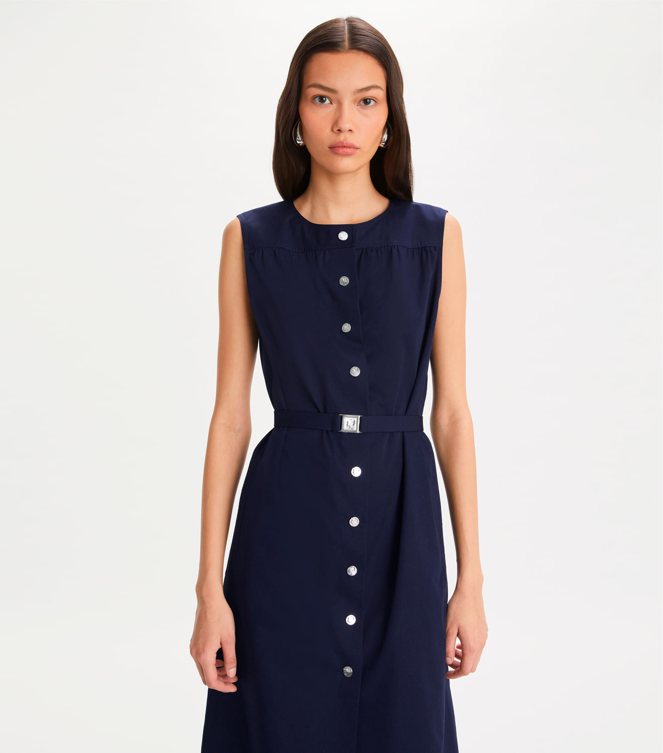 Nosso vestido de botão de popeline de algodão é universalmente elegante, com um ajuste relaxado e silhueta de decote canoa. Use-o com ou sem o cinto elástico combinando. Perfeito para o trabalho, fins de semana e tudo mais.